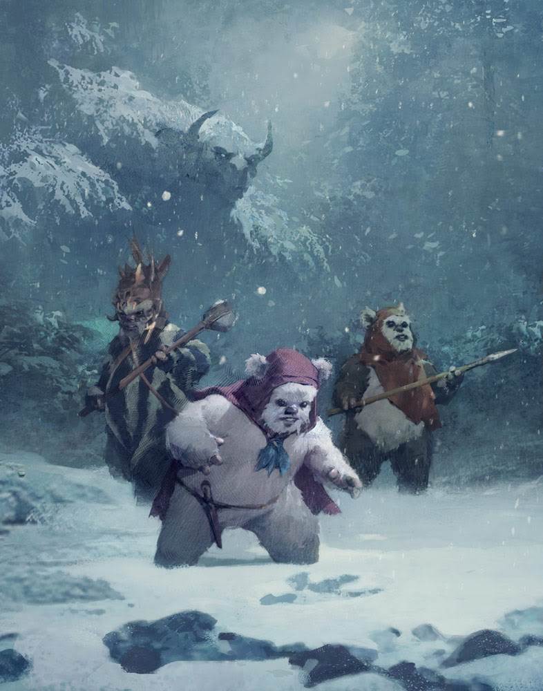 Readers are then treated to tales about a droid-servicing Santa Claus equivalent called the Oil-Bringer, a wintertime Twi’lek tradition of keeping the dark side at bay, Wicket Warrick and friends hunting a mythical beast in the snow on the Forest Moon of Endor, two childhood friends divided by war and reunited via song, spooky ghosts of long-ago battles, ancient rituals on Jedha, and lastly a follow-up to the furry family of Itchy, Malla, and Lumpy as they wait for Chewbacca’s regular Life Day return once again. There are eight total stories that breeze by pretty quickly with setups and payoffs for characters both new and familiar to fans of the franchise, but the yarns might just be the perfect length to read to younglings as they are tucked into bed awaiting their own terrestrial holiday festivities.