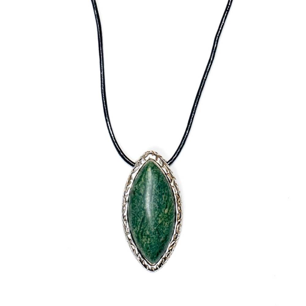 - Necklace includes a leather cord and a stainless-steel pendant.