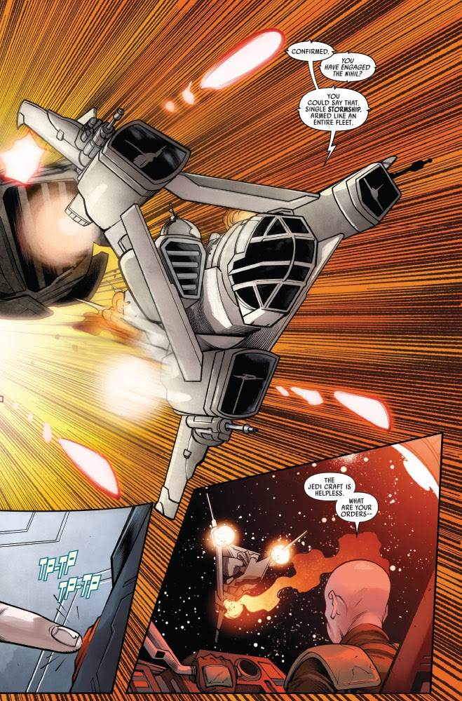 The High Republic #9 begins with a shocking in medias res opening space-battle sequence that sees Wayseeker Jedi Orla Jareni in combat against a Nihil stormship commanded by none other than Jedi Knight Keeve Trennis, who we’ve come to know as one of the central protagonists of this comic series. Why has Trennis seemingly given up the path of the light to join the Jedi Order’s sworn enemy? We’re immediately given a series of flashbacks to explain how these characters got to that point, though I won’t spoil the eventual reveal in this review. Suffice it to say that we do get an explanation pretty much right away (I was afraid we’d have to wait until next month, or worse yet the end of this arc) and the action continues in the “present” as more Starlight Jedi-- including my favorite, Master Skeer-- show up to defend Jareni from the perceived Nihil attack. Then we follow Keeve and her apparent deserter-in-arms Terec to a Nihil base where she makes contact with the local leadership of her new faction. But as I hinted at earlier, things may not be quite exactly what they seem, but I’ll let the comic itself tell you the whys and hows if you choose to read it.