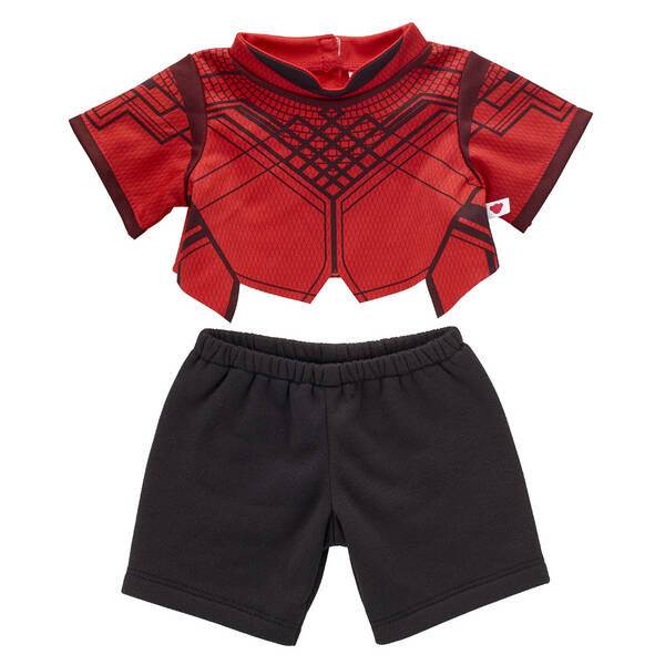 - Two-piece Shang-Chi costume for stuffed animals includes a red top with black pants