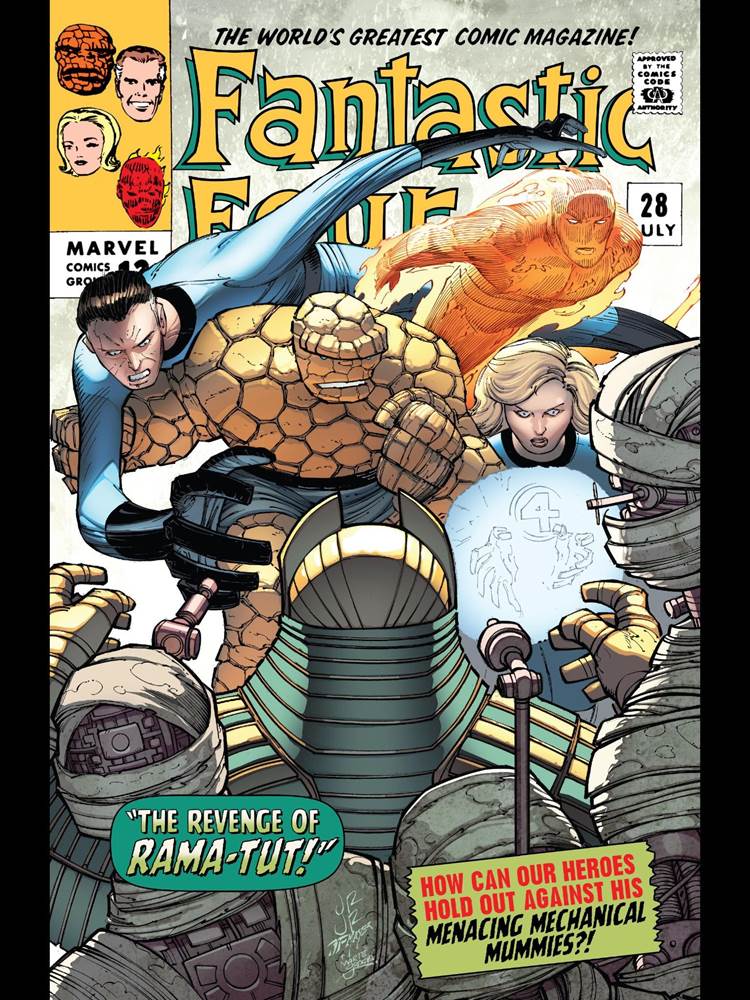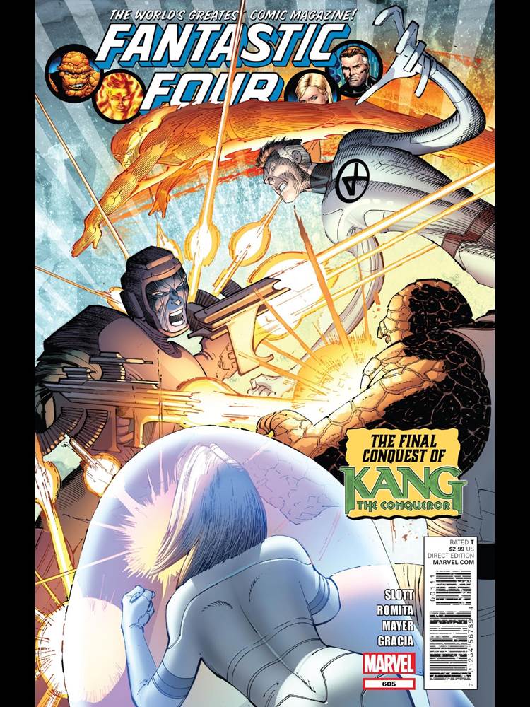 The Fantastic Four are just getting home from their most recent incident in Latveria and need to immediately get to work on finding a solution on Johnny Storm’s hot new problem. Of course, even while dealign with one problem, the next one is never too far away. Enter: Kang the Conqueror.