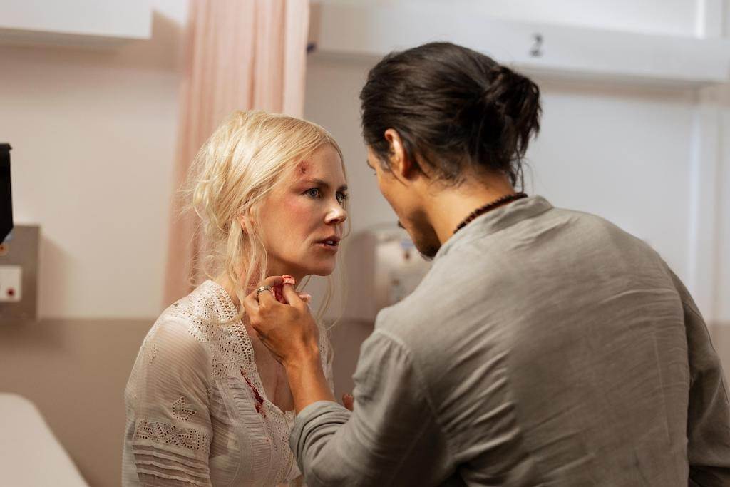 Masha (Nicole Kidman) is having a private moment in the woods with her past. From the greenery of the present day, Masha remembers back to Russia watching her daughter ride a bike and living through the heartbreak of watching her child be struck by a car. Ripped from her memory, Masha is attacked by Carmel (Regina Hall). Poor Carmel is not doing well with the increased dosage of drugs, and has a hallucination that Masha is her husband’s new wife. The brutal beating is only stopped when Yao (Manny Jacinto) intervenes.