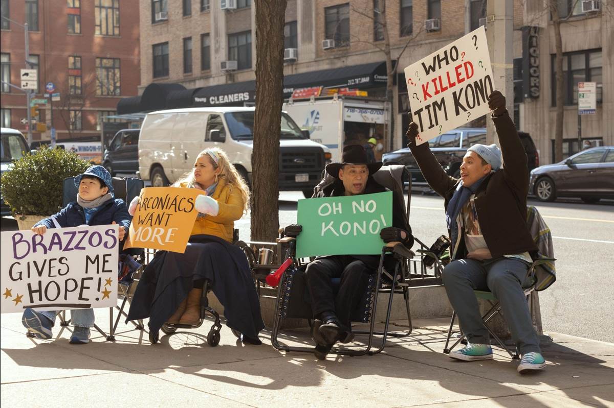 Teddy and Theo are on the couch when a push alert causes Theo to sigh and emit some profanities. He holds up his phone to show Theo the title of the new episode: “The Dimases Take a Dip.” A knock at the door reveals Detective Williams with two officers to apprehend the father and son. We then see other residents of The Arconia listening, including an employee named Lester (Teddy Coluca) while he delivers a resident’s dry cleaning, Bunny (Jayne Houdyshell), Uma (Jackie Hoffman) and Will (Ryan Broussard). The fans are camped outside listening as well. The youngest member of the group Grant (Orson Hong), who wasn’t with the group upstairs, asks an important question: Why would the sponsor pay for a podcast that could out him?