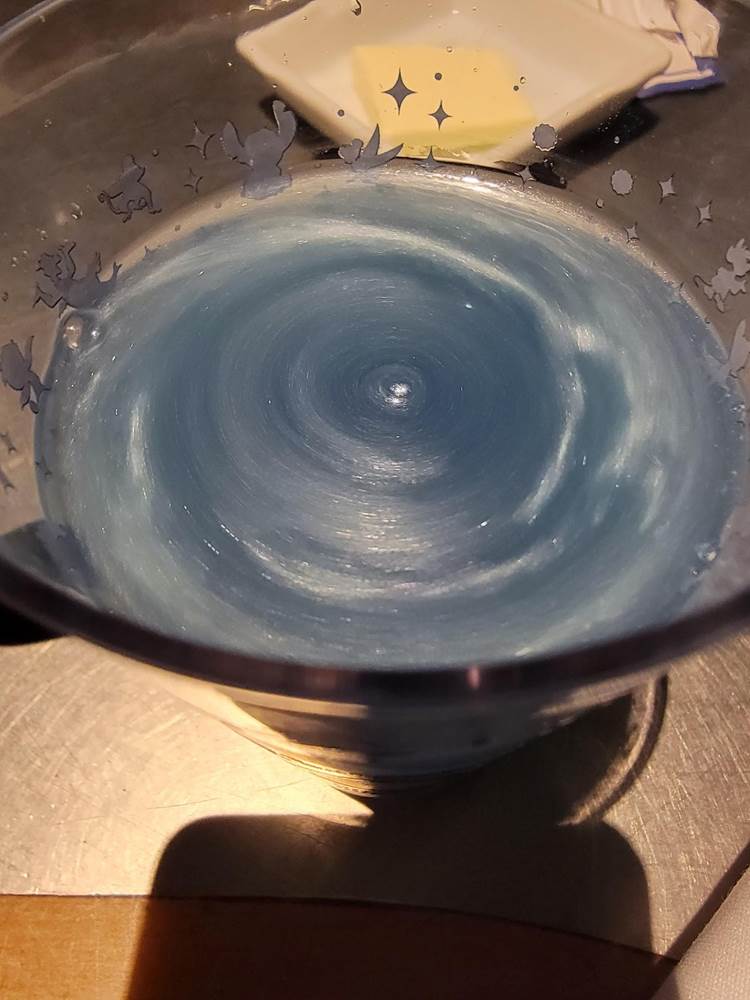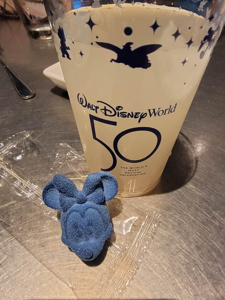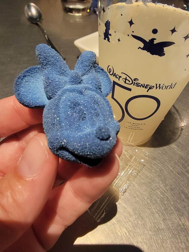 Alongside the beverage was a shimmering blue Minnie.While it was designed to sit on the rim, our server explained that far too many were breaking in transit from kitchen to table so they were now offering the separately and still individually wrapped. Curious about the Minnie sugar shape, my dining companion bit off her nose and described it as a very sweet berry flavor, most likely a blue raspberry. I had sampled the lemonade and it was extremely tart, which makes sense given what was about to happen.
