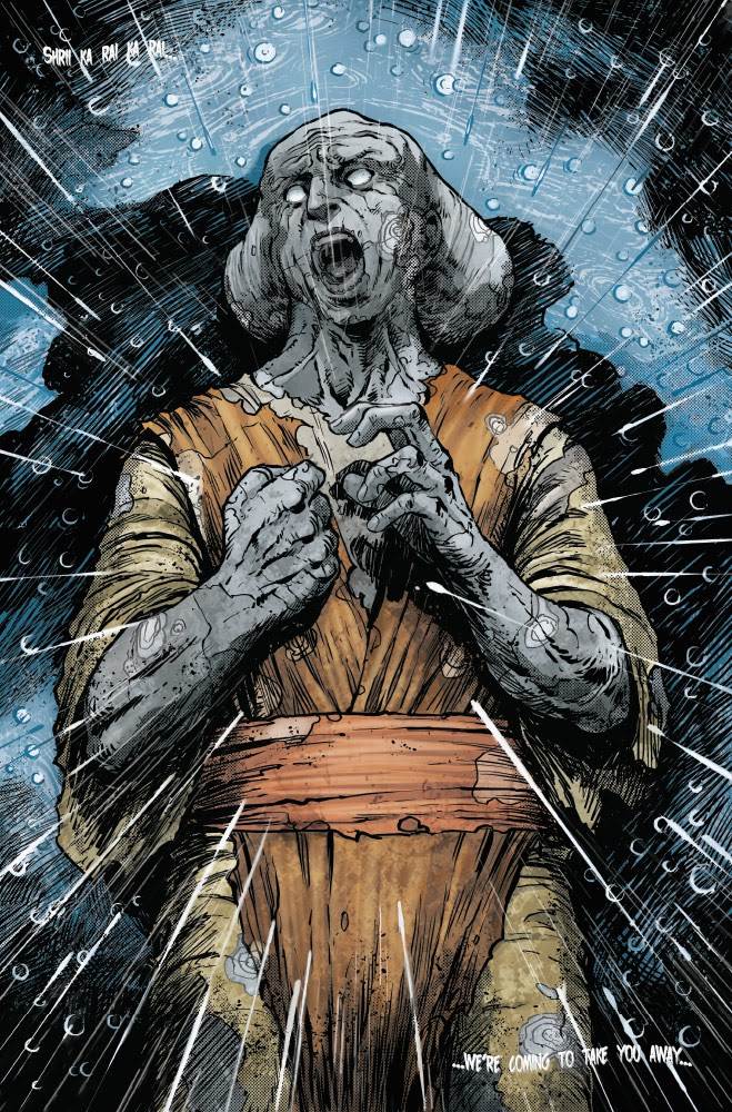The haunting image of Greatstorm’s lifeless corpse opens the issue with an ominous, foreboding tone that reverberates throughout, as we follow Jedi Knight Emerick Caphtor, tasked with finding answers regarding this shocking turn of events by Jedi Council member Stellan Gios. Meanwhile, a private investigator named Sian tracks a target through the seedy underworld of Coruscant. It’s heavily implied that these two would-be detectives are destined to cross paths during this storyline, though that doesn’t happen before the end of the first issue, which asks far more questions than it answers. What sort of weapon do the Nihil possess that’s capable of turning Jedi into dust? How is this mystery connected to Sian and the enormous alien that guns her and her contact down in a Coruscant alleyway? And why is an eerie nursery-rhyme song with frightening lyrics suddenly stuck in both Stellan and Emerick’s head?