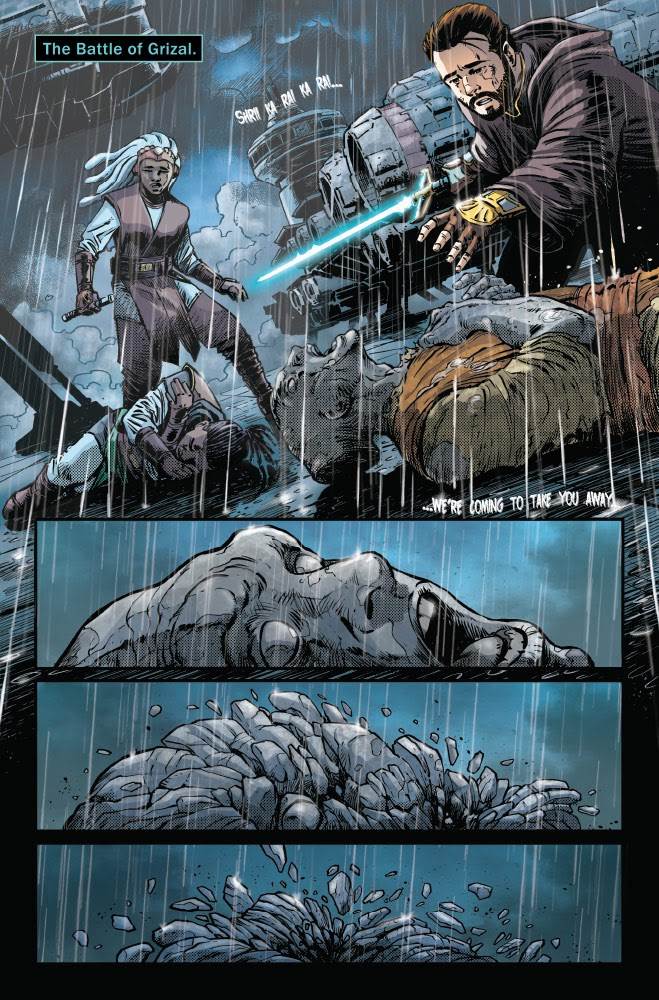 Star Wars: The High Republic - Trail of Shadows #1 picks up right where The Rising Storm left off, with Master Greatstorm having been petrified, then turned to dust, in the aftermath of the battle of Grizal– fought between the ruthless band of marauders known as the Nihil and the Jedi Knights.