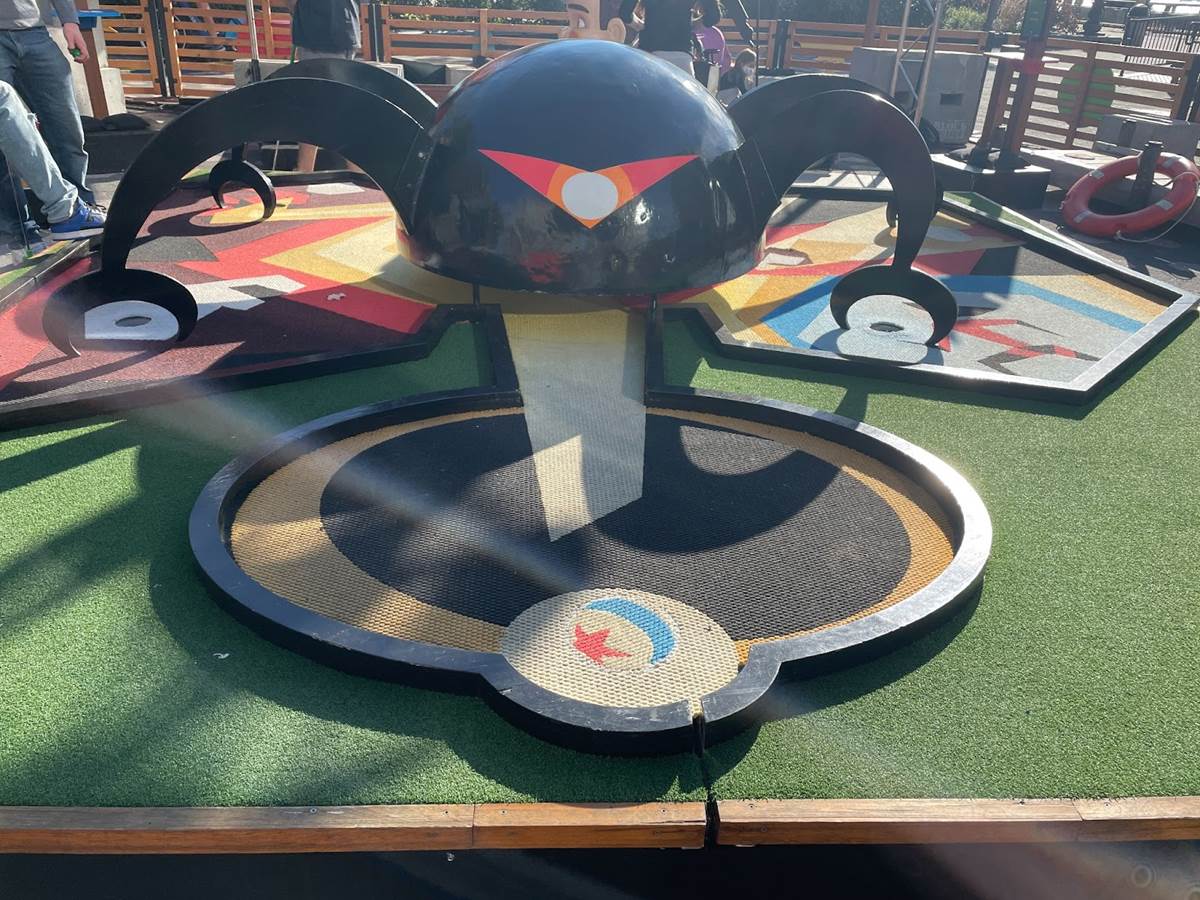 The second hole is inspired by the “Define Dancing” sequence from WALL-E. Players putt their ball through a spiral stream of fire extinguisher dust. A heart above WALL-E’s head is the goal post and if you sail your ball up the elevated Eve, you have a good chance at a hole-in-one down the ramp to WALL-E’s heart.