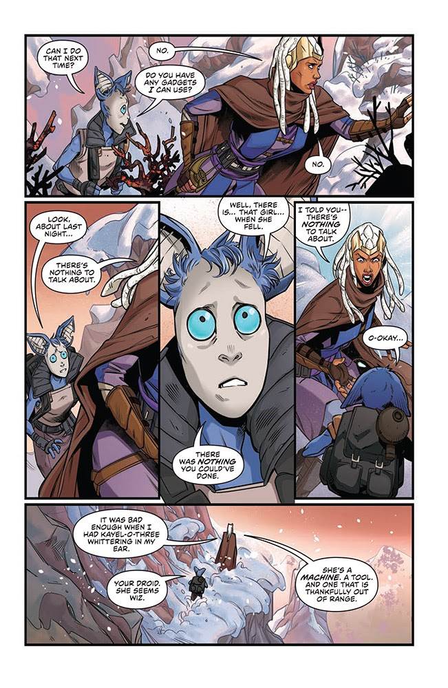 Yorrick and Drewen make their way up the titular Temple Peak, both regretting the events of the previous night during which a young girl fell to her apparent death, and eventually finding their way to the cave where the Gretalax resides. We also get the next part of a series of flashbacks to Ty’s time as a Padawan, during which she and her fellow learner Klias Teradine investigate an ancient sanctum of extinct dark-side users called the Yarrow Fellowship. They come across an artifact that seems to break Klias’s brain, but then we immediately cut back to the “present” as Ty and Drewen confront the Gretalax. There’s a fairly exciting action sequence in the cave, followed by a couple of surprising revelations that I’ll refrain from spoiling in this review. Suffice it to say that this issue ends on something of a dual cliffhanger, with readers wondering both what the truth is about the Gretalax and its relationship to the villagers below, and about the fate of Klias– already knowing that at some point after these flashbacks, Ty Yorrick left the Jedi Order.