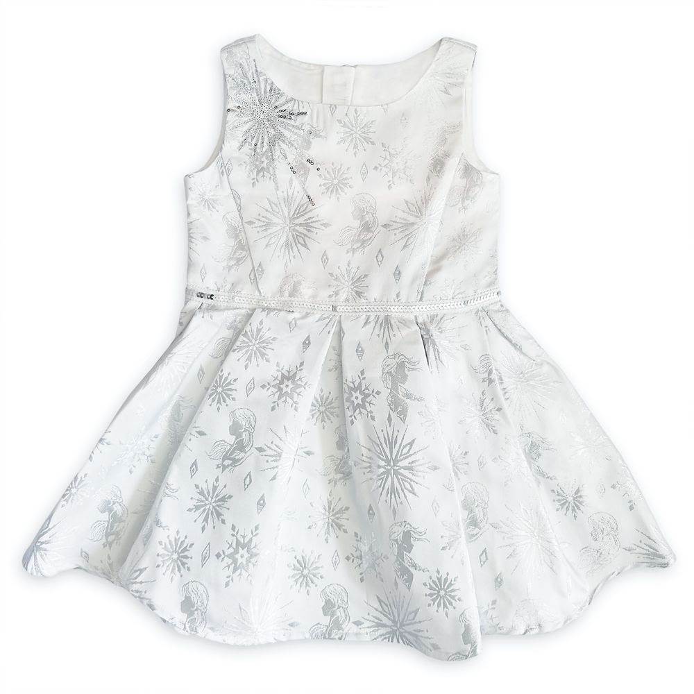 Sleeveless dress with a jacquard pattern featuring snowflakes, diamond shapes from Frozen 2 as well as the film’s heroines Elsa and Anna. A shimmering sequin snowflake design accentuates the right shoulder with a delicate sequin ribbon circling the waist and box pleats give the skirt a full volume. Available in sizes ranging from 2 - 10.