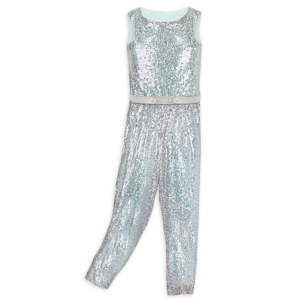 One-piece jumpsuit with sparkling silver sequins over teal fabric layer and lining. Available in sizes ranging from 3 - 10.