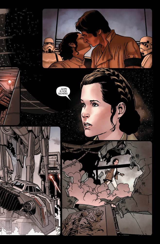 Star Wars #18 takes place after the conclusion of War of the Bounty Hunters #5, with Boba Fett having recaptured the carbonite-frozen Han Solo and taken him to Jabba’s Palace on Tatooine. But Princess Leia doesn’t know this, having seen Han plummet through the exploded floor of Darth Vader’s Super Star Destroyer Executor, and now assumes her would-be paramour to be deceased.