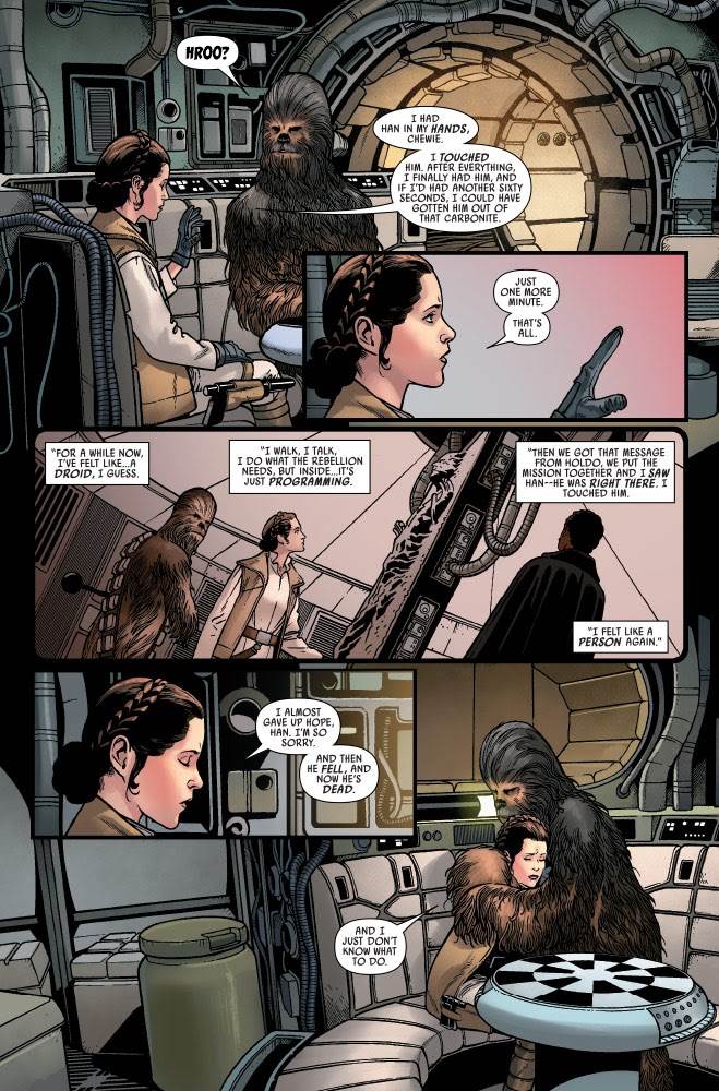 Qi’ra tells Leia about her past with Han, growing up on Corellia, and how she always saw a good side hiding underneath Solo’s irascible scoundrel persona. She also informs the Rebel Alliance leader that Crimson Dawn has operatives working in all corners of the galaxy, including the Galactic Empire, and that her intent was to orchestrate a reunion between Han and Leia after getting what she needed from that carbonite block– though Leia is having none of it due to her grief and anger. It’s a tense discussion with plenty of crisp dialogue from Soule’s pen, and the gorgeously staged illustrations by artist Ramon Rosanas and colorist Rachelle Rosenberg go a long way in conveying a properly somber tone for the proceedings.