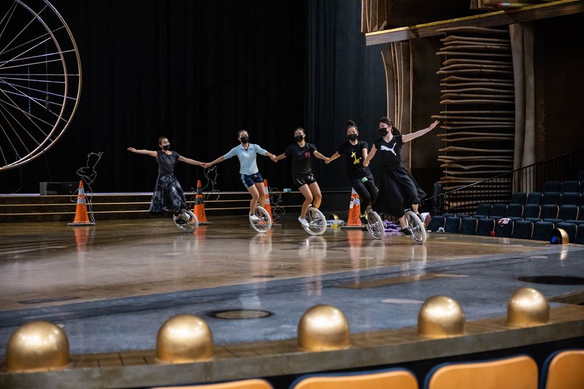 “Garden of Lines” unicycle act, Julie is swept into a wonderland of familiar shadows, shapes and outlines in an homage to cherished tales that inspire an animator. Julie’s whimsical mood fixates on a mischievous marionette from a time-honored Italian fairytale. Five playful unicyclists representing the Blue Fairy of the classic Disney Animation film Pinocchio appear to effortlessly float across the stage, performing synchronized stunts and individual tricks with pinpoint precision.