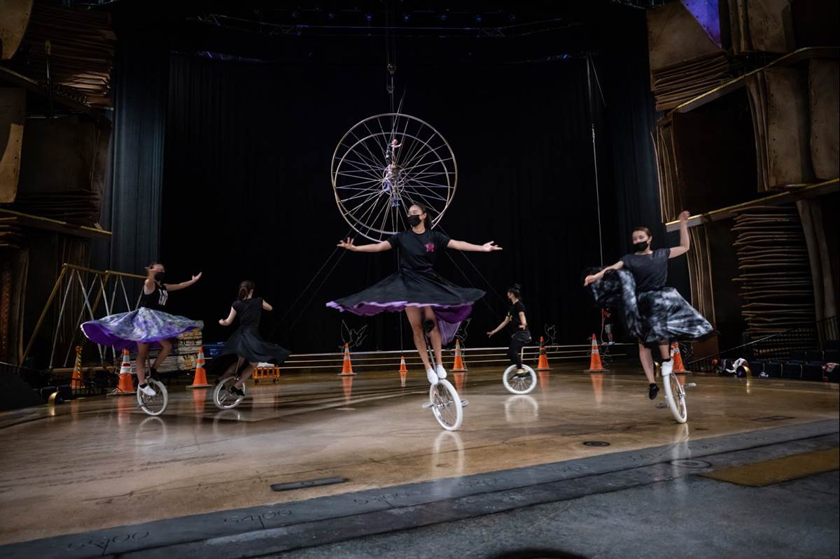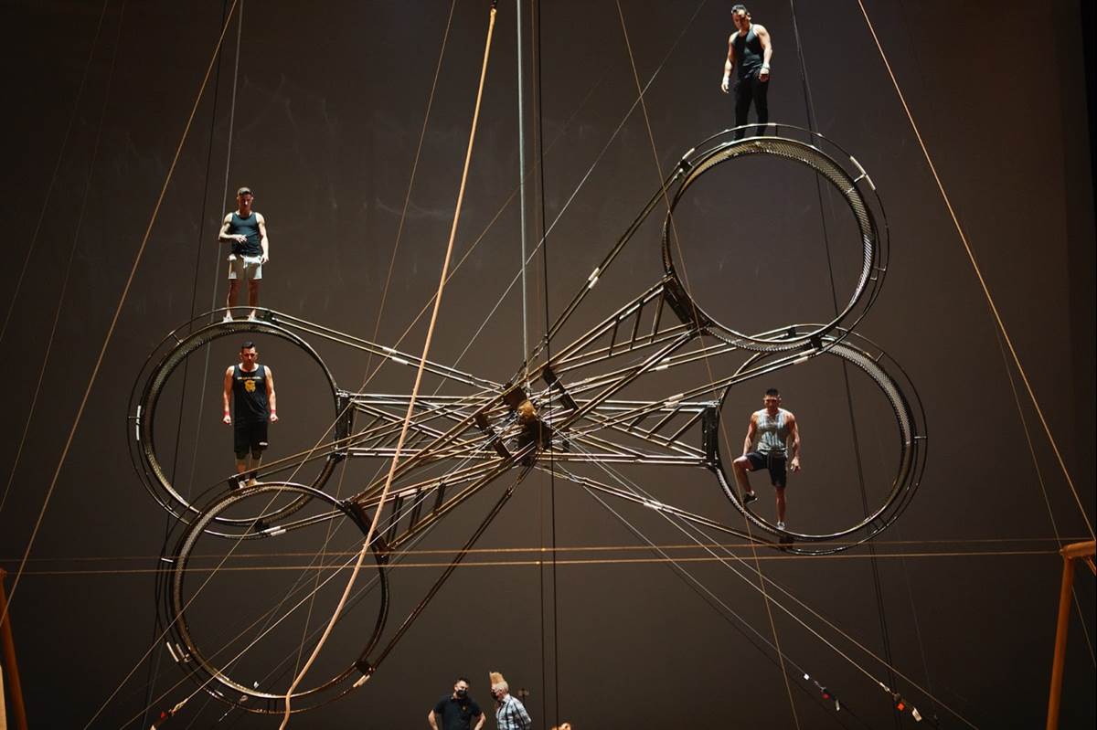 The Old Mill double wheel act is inspired by Walt Disney’s groundbreaking 1937 animated short of the same name, which is seen in projections throughout. In a display of tenacity, perseverance and rise-and-fall motion, owls dreamed up by Julie’s imagination weather a storm using teamwork and courage to carry them through the powerful wind and rain that threaten their windmill home. The windmill of the film is represented in a spectacular, churning, fast-moving double wheel structure. Gravity-defying acrobats are in constant motion with the turning wheels—at times airborne—with astonishing balance and agility.
