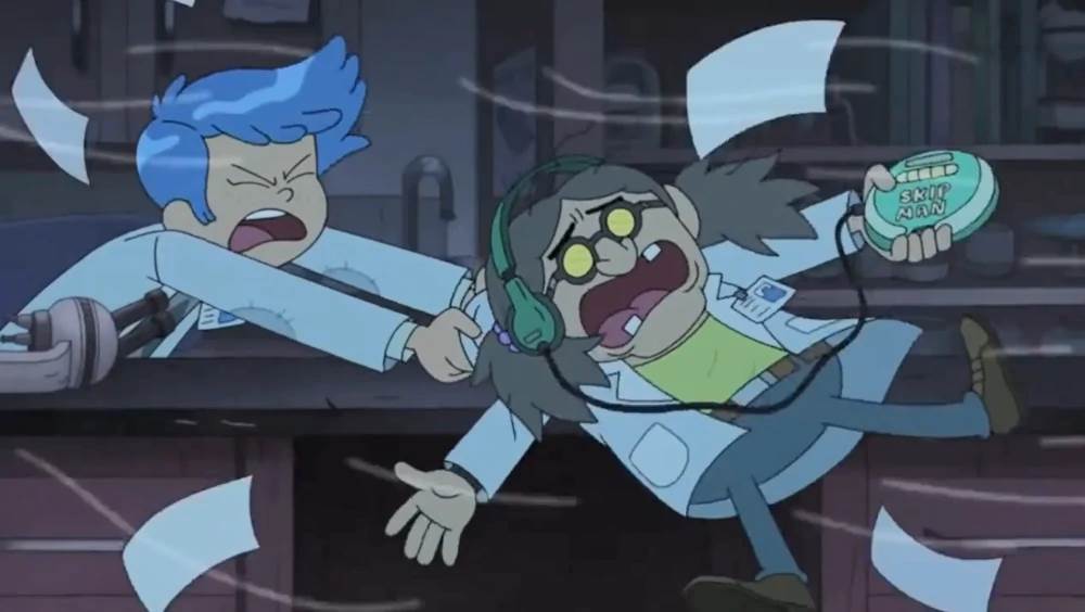 While there, the group poses as reporters interested in her real studies, not just the kids' experiments. After some bartering they are let in, where Dr. Frakes explains that only recently did her studies lunge forward when an energy event opened a portal in her equipment, and we see the flashback of Anne, Sasha, and Marcy opening the Calamity Box and being sucked into Amphibia, but also at Frake’s lab, where a skipman was sucked into the energy field. This skipman was seen in a previous episode, “Wax Museum.”