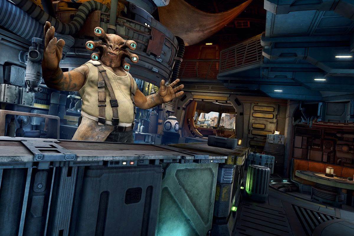 What about recording Seezelslak’s dialogue and his little bits of banter with the player’s character? “They let me have fun with that. A lot of those little fun things were improvised,” says Moynihan, who is also a gamer himself and has explored the world of Tales from the Galaxy’s Edge on his own time. “When I started playing it, I spent way too much time in the cantina because [the bartender character] was me. I wanted to stay there, and I couldn't believe it. It feels like Tales has its own characters, there's that section, [and] then there's the legacy characters [like Hondo Ohnaka, C-3PO, and R2-D2]… and when they show up your mind is blown.” On the subject of the gameplay itself, Bobby was impressed by the range of things the player can do. “The variety was amazing. I loved Vader Immortal, but I couldn't believe how many different types of things you can do in this game. It seems much more vast. It branches out so much more. That made me really happy.”