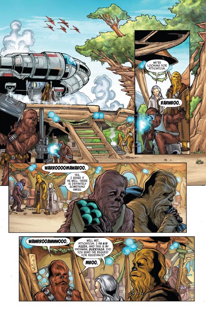 I was surprised to learn how early on in the Star Wars timeline Solo lost control of the Millennium Falcon, as we see him piloting the heavy freighter Ervana to Batuu. He and Chewie are in Black Spire to conduct some underworld-type business (it seems odd to me that Han would be involved in this kind of stuff while still married to Leia) on what happens to be Life Day, and when Solo seeks out a souvenir to purchase for his Wookiee pal it reminds him of a few tales from past experiences with the holiday. We first flash back to the High Republic era, during which Padawan Burryaga Agaburry and his human Jedi Master Nib Assek travel to the Wookiee homeworld of Kashyyyk to investigate rumors that the sentient dark-side plant monsters known as the Drengir have invaded the planet. Then we see a younger Han Solo’s trip to Lessa-7, where he and Chewbacca uncover a ring of Trandoshan slavers and free their Wookiee prisoners. Lastly, the duo enlist the help of the fussy protocol droid C-3PO for a secret mission on the planet Kudo. All of these events take place on and tie in with Life Day in some way, helping to refresh Solo’s memory during a crisis in the “present” regarding what the holiday is really all about.