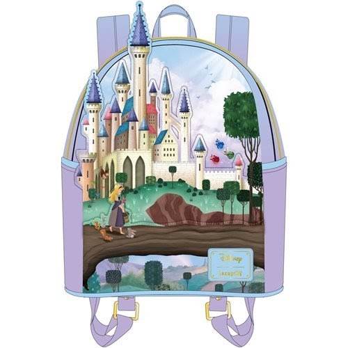 The crossbody bag and mini backpack give a full landscape of the castle in the background accented with square shaped trees. Briar Rose and some forest friends can also be spotted walking a forest path.