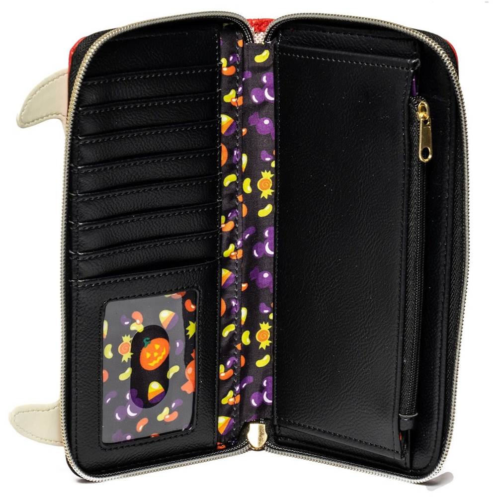 The cute zip-wallet showcases the sometimes exasperated duck in a devil costume complete with horns. The front shows his angry eyes, while the pointed tail can be seen on the back. The inside features a Halloween lining with pumpkins, candy corn and hidden Mickeys.