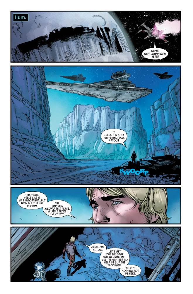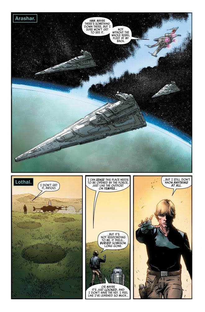 Star Wars #19 begins with the above-mentioned Rebel Alliance briefing, where Luke finds himself distracted by the list of possible Jedi holy sites that R2-D2 found in an old Imperial archive. Leia gives him permission to leave, so Luke sets off on a quest to see if he can track down any more ancient Jedi temples. It’s obvious that this path will eventually lead him to discover Ahch-To– either in these pages or sometime after the events of Return of the Jedi– but for now he visits Ilum (which is evidently already in the process of being transformed into Starkiller Base), Arashar (which is overpopulated by an Imperial Star Destroyer occupation), and Lothal (where he apparently doesn’t possess the right Force “key” to open the temple Ezra Bridger entered in Star Wars Rebels) before settling on the River Moon of Al’doleem, first seen in writer Charles Soule’s Star Wars: Darth Vader - Dark Lord of the Sith comic book from 2017. It’s no coincidence that Soule is also the writer of this particular story arc, and I absolutely love that he’s choosing to go back and revisit familiar locations to dig up relics of the past. On Al’doleem we get flashbacks to Vader’s seek-and-destroy mission against Jedi Master Kirak Infil’a just after the conclusion of the Clone Wars, and Luke meets a friendly mechanic who’s justifiably willing to help him figure out what the Empire wants from the local Jedi monastery.