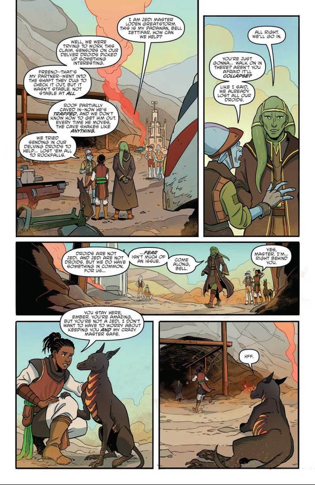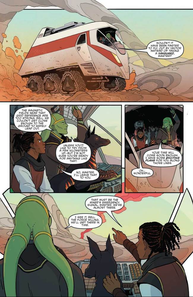 In the first story, entitled “Set for Life,” writer Charles Soule (Star Wars: The High Republic - Light of the Jedi) and artist Sam Beck (Verse) rewind time to a more peaceful, pre-Nihil-prominence period of the galaxy’s Outer Rim. On the planet Elphrona, Jedi Master Loden Greatstorm and his Padawan learner Bell Zettifar are called to rescue a civilian trapped in a mining accident. During this adventure, Bell learns about the cost of selfishness and must face the dangers associated with the Jedi Order’s solemn oath to help others. Up next is “No Stone Unturned,” written by Claudi Gray (Star Wars: The High Republic - Into the Dark) and illustrated by Jason Loo (The Pitiful Human-Lizard), in which we get to follow the crew of the Vessel– namely Leox Gyasi, Affie Hollow, and Geode– as they embark on an Indiana Jones-style quest to steal an ancient artifact from ruins they thought to be abandoned, only to immediately find out how wrong they were. Third is “First Mission” by Justina Ireland (Star Wars: The High Republic - Out of the Shadows) with art by Yael Nathan (Star Wars Adventures), in which we get to see the initial meeting between Vernestra Rwoh and her new Jedi Master Stellan Gios, as they set out to monitor a diplomatic banquet attended by the devious Jabba the Hutt.