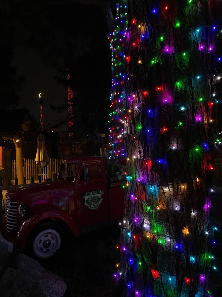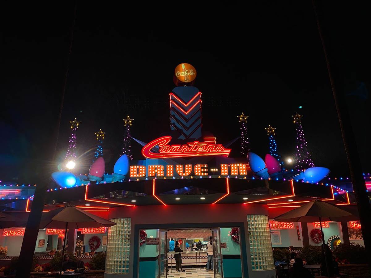 One of my favorite sets of decorations in the park are these oversized Christmas lights on Coasters Drive-In.