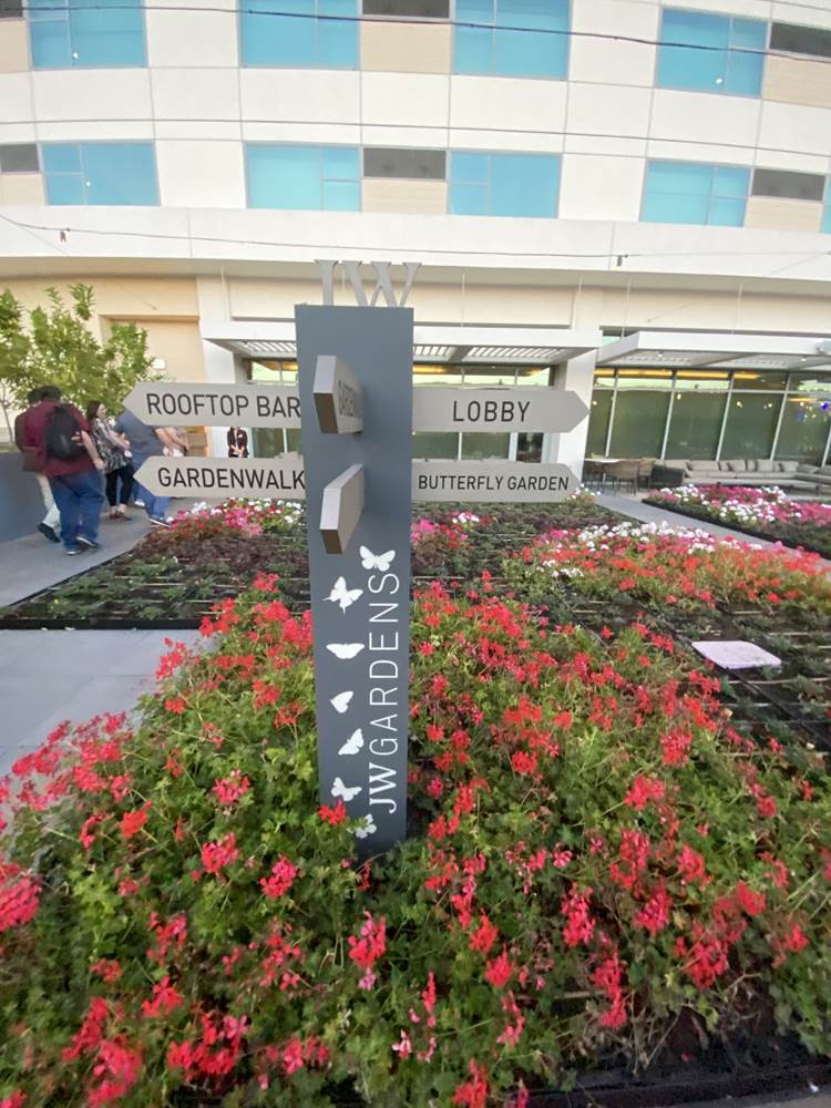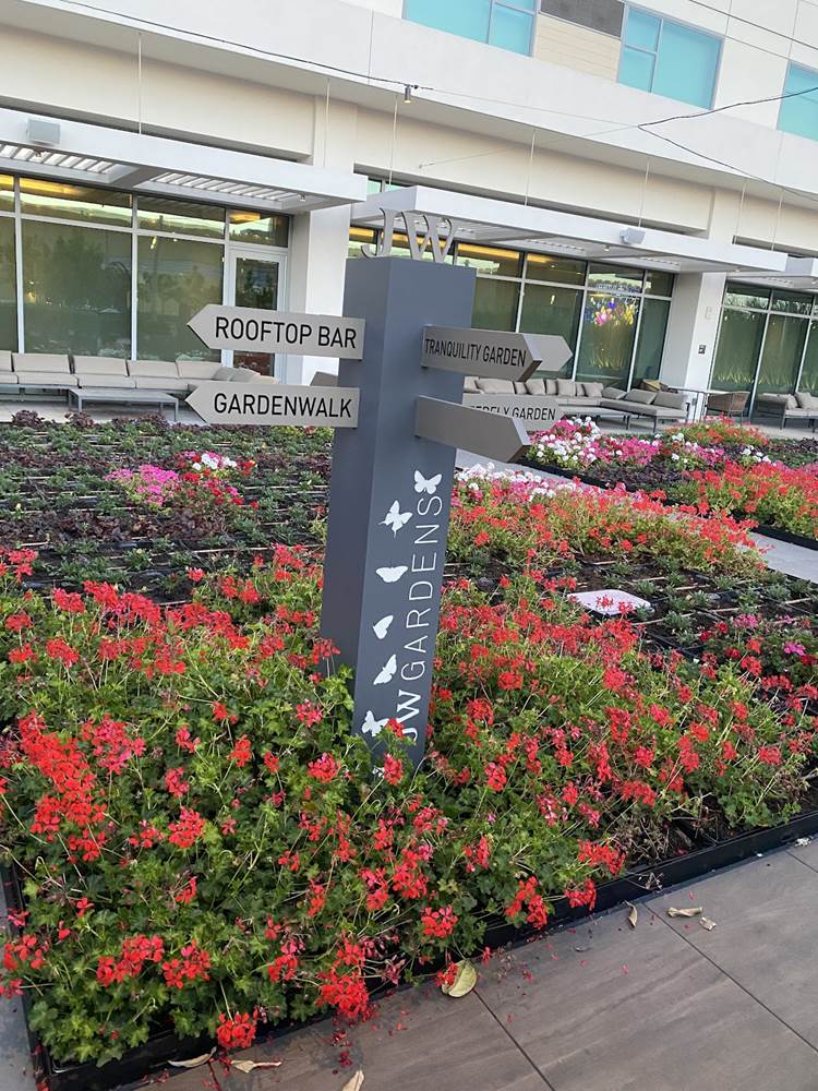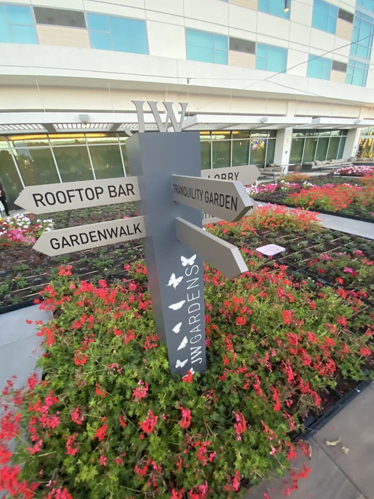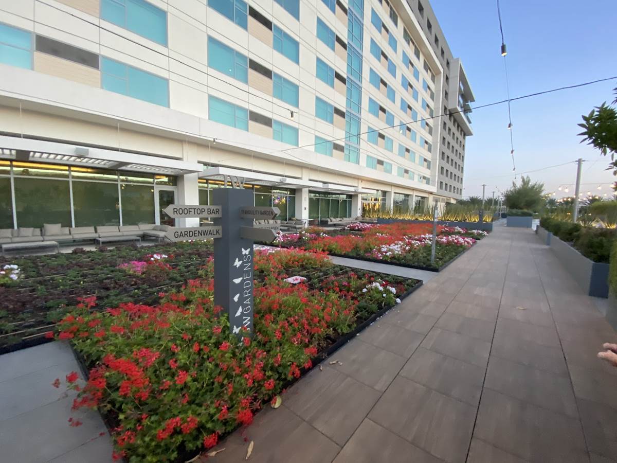 Between GardenWalk and the JW Marriott sits the resort’s JW Garden. This space has actually won the Julie Mayer Award, the highest honor from Anaheim’s 2020 Art in Public Places. Throughout the garden are sculptures and other art pieces, but the JW Garden carries over the agricultural aesthetic and actually plays a significant role in the development of the hotel’s food and beverage programs by providing fruits, herbs, and vegetables such as kale, basil, strawberries, and jalapenos.