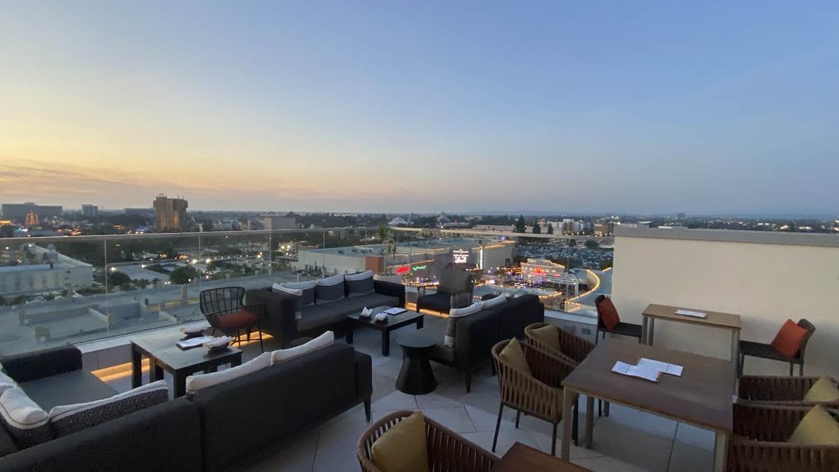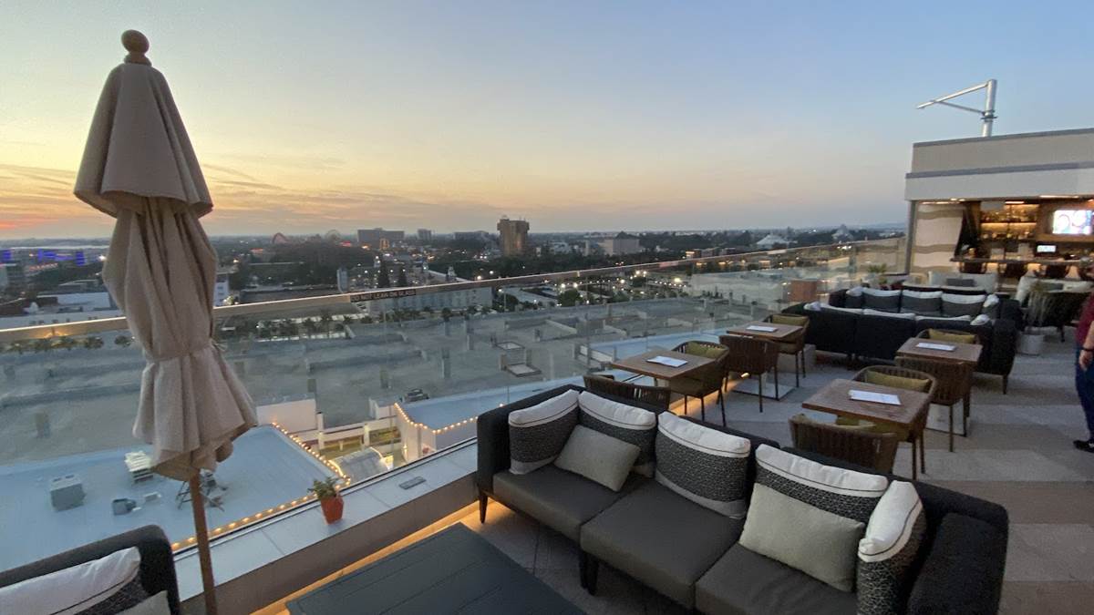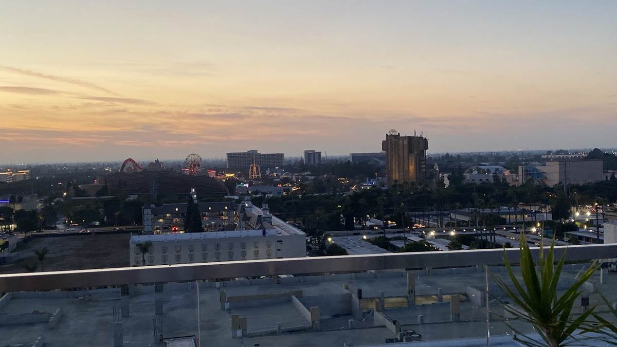But we’re here to enjoy the rooftop highlight of the resort - the Parkestry Rooftop Bar and Lounge. As of right now, it’s the most elevated bar and lounge area in the city, with views of neighboring Disneyland Resort, the legendary sunsets of Southern California, and on clear days, Downtown Los Angeles and even Catalina Island. We were even told that the legend of the day they saw the famous Hollywood sign from this location, but I call that a legend because I can’t see it when I’m right beneath it. Best of all, this space is open to all, not just those staying at the hotel. Disney fans will love the location as a cursory glance will offer views of Pixar Pier (and likely some of World of Color when it returns), Guardians of the Galaxy - Mission: Breakout, Space Mountain, Matterhorn Bobsleds, and Star Wars: Galaxy’s Edge in the distance. More focus will reveal even more locations like Sleeping Beauty Castle, Grizzly Peak, the top of the Moonliner and other taller visual landmarks of the parks.