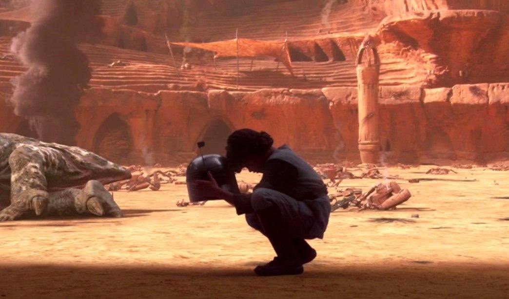 3 - Geonosis: In another flash, Boba sees the arena on the planet from the climax of Attack of the Clones, where his “father” Jango Fett was decapitated by Jedi Master Mace Windu.