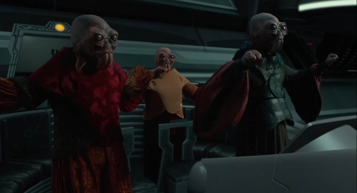 25 - Max Rebo: Probably the happiest moment of this episode comes when we find out that the Ortolan Jabba’s Palace musician Max Rebo evidently survived the sail barge explosion, and is now performing at “The Sanctuary”-- an underground casino run by Jennifer Beals’s Twi’lek character. Max plays alongside a Bith musician (could this be a former member of the Modal Nodes?) and a droid drummer, and together they deliver a remixed rendition of John Williams’s famous “Cantina Band” music from A New Hope.