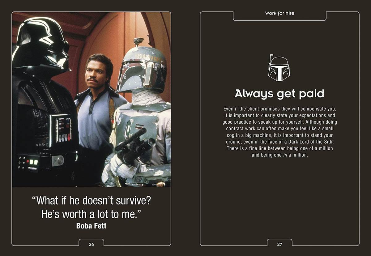 Franco: I think the awesome thing about Boba Fett is– especially in the early films– he showed how he could work for both Darth Vader and Jabba the Hutt, and work the system. So the book, for me, is about good freelance advice. I was a freelancer for a few years. It’s all about the hustle– getting out there and getting things done, so the advice is very practical… and also in-world. That’s how these books are written: it’s a little bit of both good advice for anyone [and Star Wars elements].