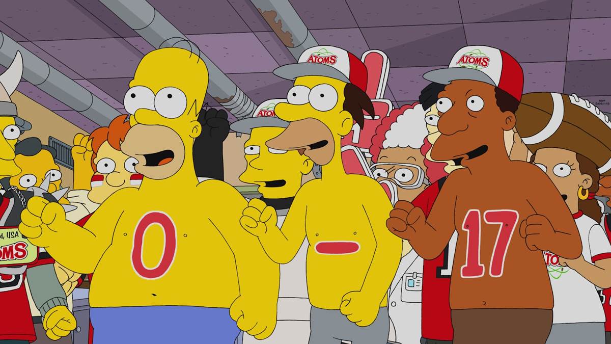 A new commercial is created showing Mathers chugging Mr. Burns’s brand of brandy, and in celebration the football player hugs his new boss, which endears him to Burns. The Simpsons attend an Atoms game at the arena, where Bart notices that Mathers looks hungover from his night out clubbing at “The Hay” and “The Sack” (where the afterparty was). Grayson drops an easy pass and gets angrily booed by the crowd. “The 22-year-old I bet all my happiness on is nothing but a bust,” complains Homer. Mr. Burns is offended by the booing, and Mathers literally gets “Haterade” dumped on him by his teammates, followed by an unending pile of thundersticks and souvenir loaded nachos. “There are worse things to be buried under,” says an uncharacteristically optimistic Mr. Burns.