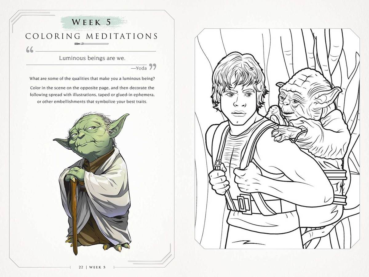 Star Wars: Inner Jedi consists of 52 weeks’ worth of examples and quotes from the Star Wars movies and television series, accompanied by daily acts and reflections such as listing mentors who have influenced you or those you have influenced through mentorship, meditation practices, coloring and drawing exercises, and enumerating one’s own goals for the year. Each week’s page heading cites a lesson from the Star Wars franchise and prompts participants to cite similar cases from their own lives.