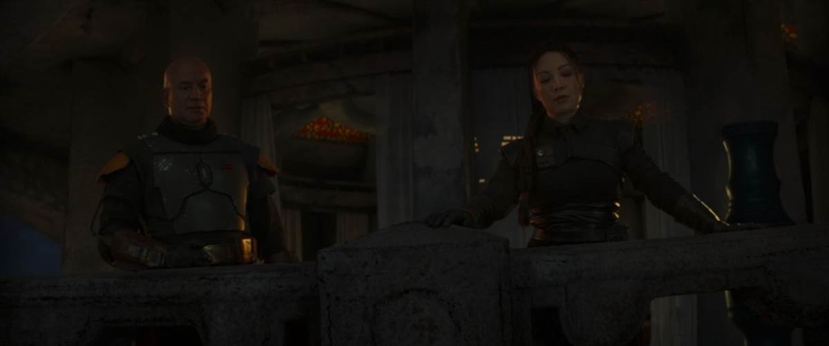 “The Gathering Storm” (directed by Kevin Tancharoen of 2009’s Fame remake) kicks things off with another extended flashback– this time to Boba Fett’s efforts in retrieving his ship the Slave I from the bowels of Jabba’s Palace. And yes, to address the elephant in the room, Fett only refers to the vessel as his “Firespray gunship,” but that’s been the in-universe class of the Slave I for many years so it doesn’t bother me too much, though why Lucasfilm has suddenly decided that the word “slave” is too hot for Star Wars is beyond me. Alone in the desert on his trusty bantha, Fett spies the flares in the night sky from “The Gunslinger” episode of The Mandalorian and finds Fennec Shand left for dead by Din Djarin and Toro Calican, so he brings her to an underground cybernetics parlor on the outskirts of Mos Eisley to have her patched up. Together they infiltrate Bib Fortuna’s parking garage in an amusing heist sequence that features some prequel-style slapstick humor with the palace droids.