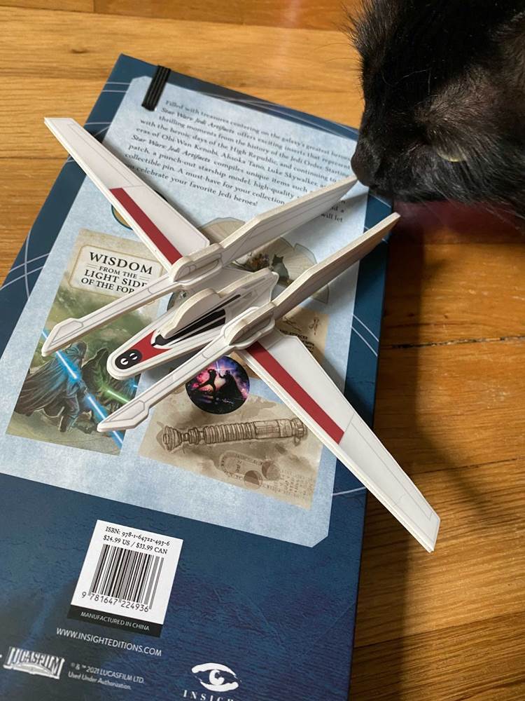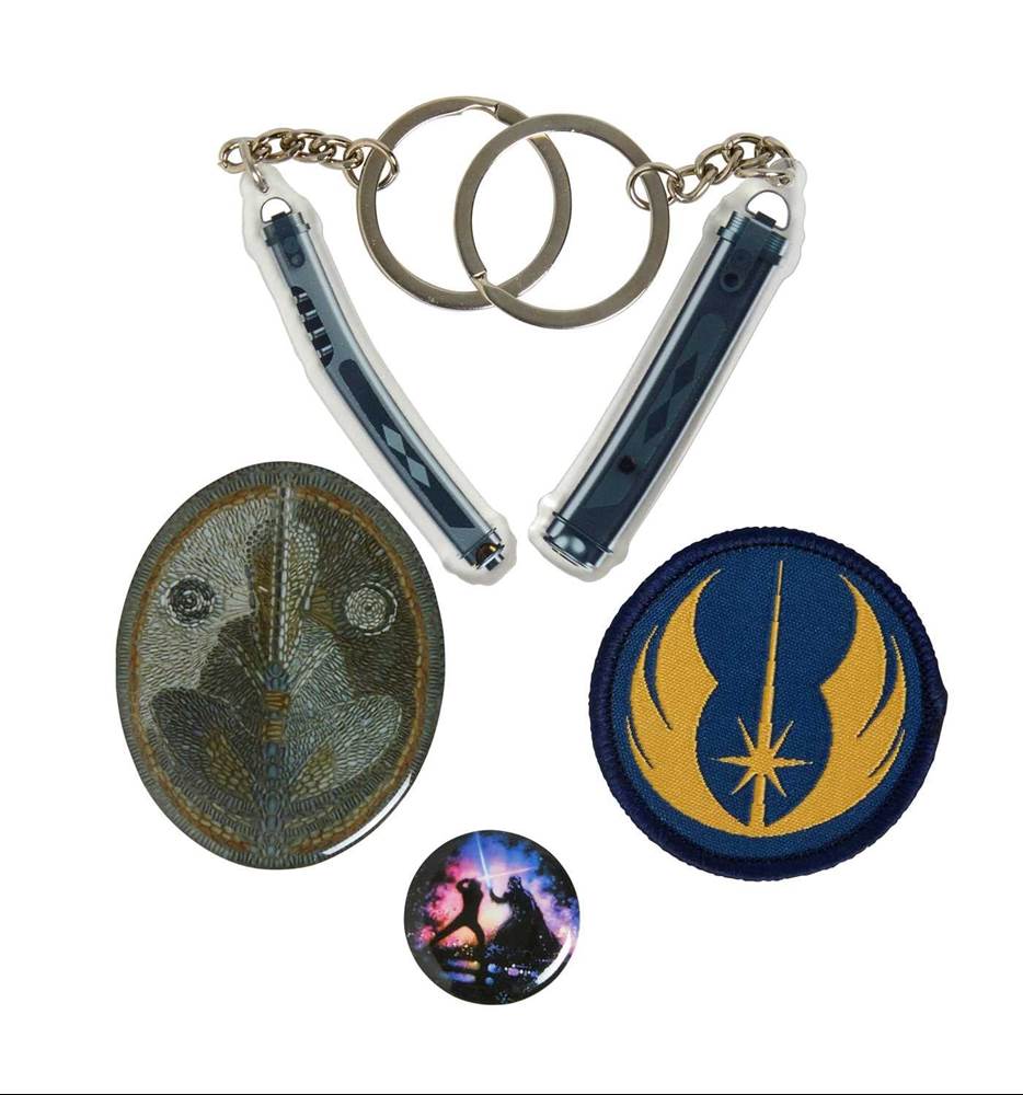 The first things one finds when opening up Star Wars: Jedi Artifacts is a letter to the reader, explaining that what’s contained therein represents “moments from the story of the Jedi Order as we know it,” dating as far back in the interconnected Star Wars timeline as Lucasfilm’s The High Republic publishing initiative and following through to The Rise of Skywalker and the conclusion of the Skywalker Saga. What follows is a brief history, as it were, of Jedi Knights and Masters like Yoda, Anakin Skywalker, Kanan Jarrus, Obi-Wan Kenobi, Luke Skywalker, Ben Solo, Ahsoka Tano, and Rey. But the real draw of this boxed set is the dozen items contained within: (SPOILERS: stop reading here if you don’t want to know the full contents of Jedi Artifacts prior to purchasing the book for yourself) (1) a sticker sheet that allows owners the opportunity to design and construct their own custom lightsaber, (2) a bumper sticker featuring the cast of characters from Star Wars Rebels, (3) a journal entry written in the Star Wars language of Aurebesh by Obi-Wan himself during his exile on Tatooine, (4) a small button depicting Luke and Vader’s lightsaber duel from The Empire Strikes Back, (5) dual Ahsoka saber hilt keychains, (6) a magnet showcasing the mosaic art from the Ahch-To temple in The Last Jedi, (7) a Jedi Order insignia patch, (8) a guide to lightsaber combat stances and attacks, (9) a diagram of a saber’s inner workings, (10) a handy pocket-sized reminder of the Jedi Code, (11) a 14-page pamphlet boasting “Wisdom from the Light Side of the Force,” and (12) a buildable cardboard/foam model of a Jedi Vector starfighter from The High Republic.