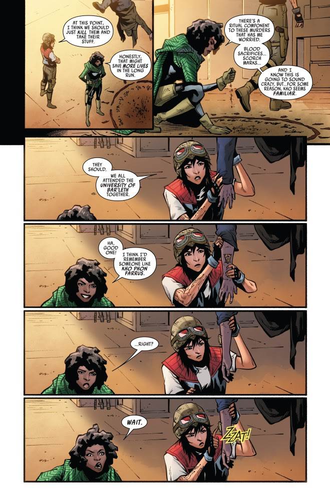 Naturally, Aphra and Starros are seeking out the same artifacts (I honestly forget why, but I think it’s an assignment from the evil industrialist Domina Tagge, who has the two rogue adventurers under her thumb) so they’re in pursuit of Farrus, who also happens to be committing a series of disturbing ritual murders along the way. But first, this issue checks in with skilled assassin Just Lucky, who’s hanging out in Canto Bight after returning from the ordeal on Jekara (see Star Wars: War of the Bounty Hunters for more) and considers what to do with the valuable Ring of Vaale he’s stolen from Domina’s nephew Ronen Tagge. Lucky’s had a falling out with his own ex-lover Ariole Yu, who has now disappeared, so he hesitantly returns to the Tagge compound. Then Chelli and Sana’s narrative jumps ahead in time a bit, and we see that they’ve been chasing Kho Phon Farrus from planet to planet to no avail. Desperate for a plan, they enlist disgraced scientist Beol De’Rruyet to help them lure the false Sith into a trap.