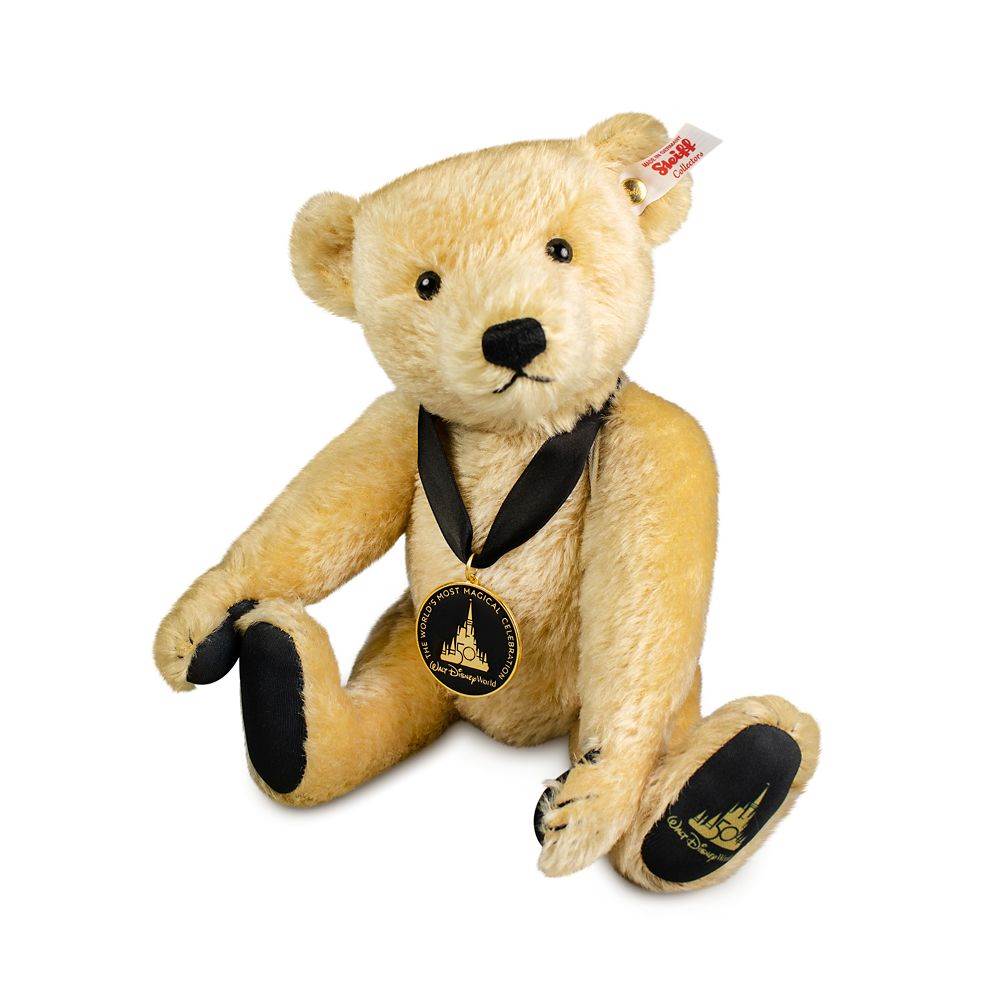 “Made of the finest mohair, and featuring a classic teddy bear design, this cuddly collectible proudly wears a medallion commemorating Walt Disney World's 50th anniversary, plus the anniversary's logo on its left paw.”