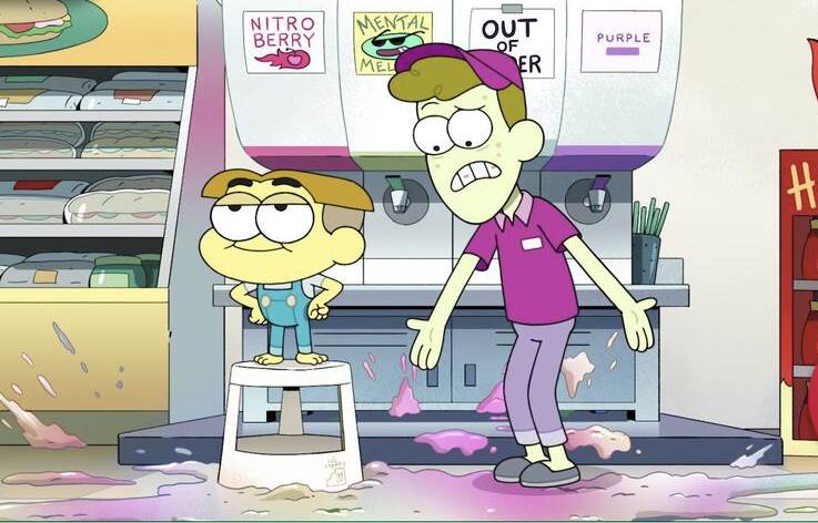 The two run into the store and right to the Splishy machine before getting stopped in their tracks. Tilly is more than welcome to enjoy her free drink, but Cricket is in clear violation of the “No Shoes No Shirt No Service” policy. Despite his pleas, Cricket is denied. Even Tilly offers to share hers, but the attendant, Clark, quickly says that that is also a clear violation of the rules and sharing can result in the forfeiture of her beverage.