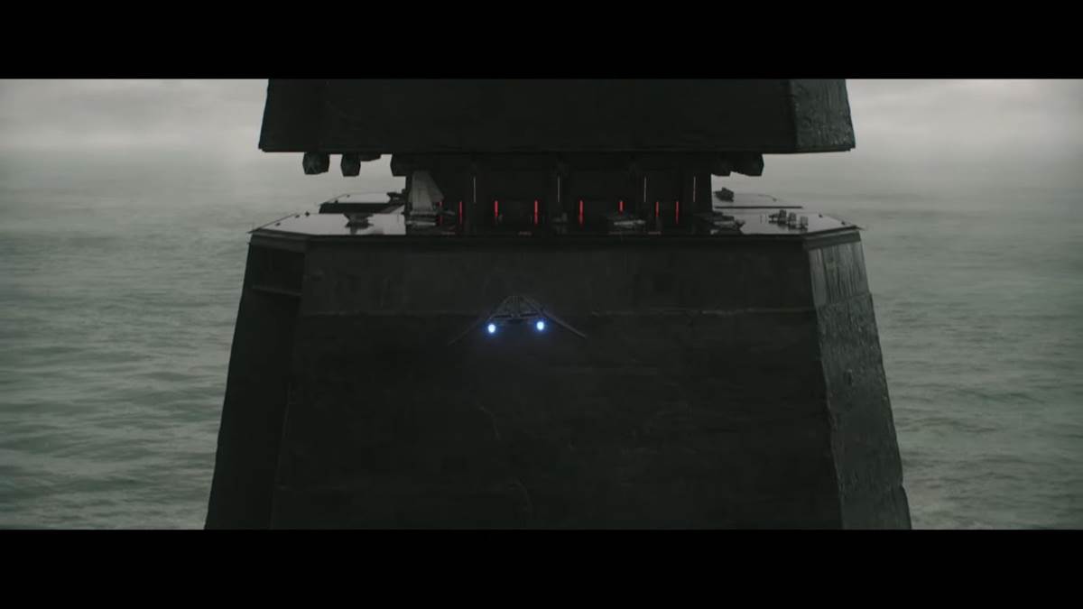 Shot 9B: The camera tilts up as the ship approaches its destination– an obelisk-shaped Imperial base on an ocean planet with a landing pad situated in an opening in its core. We can see some other Imperial shuttles and transports parked on the platform.