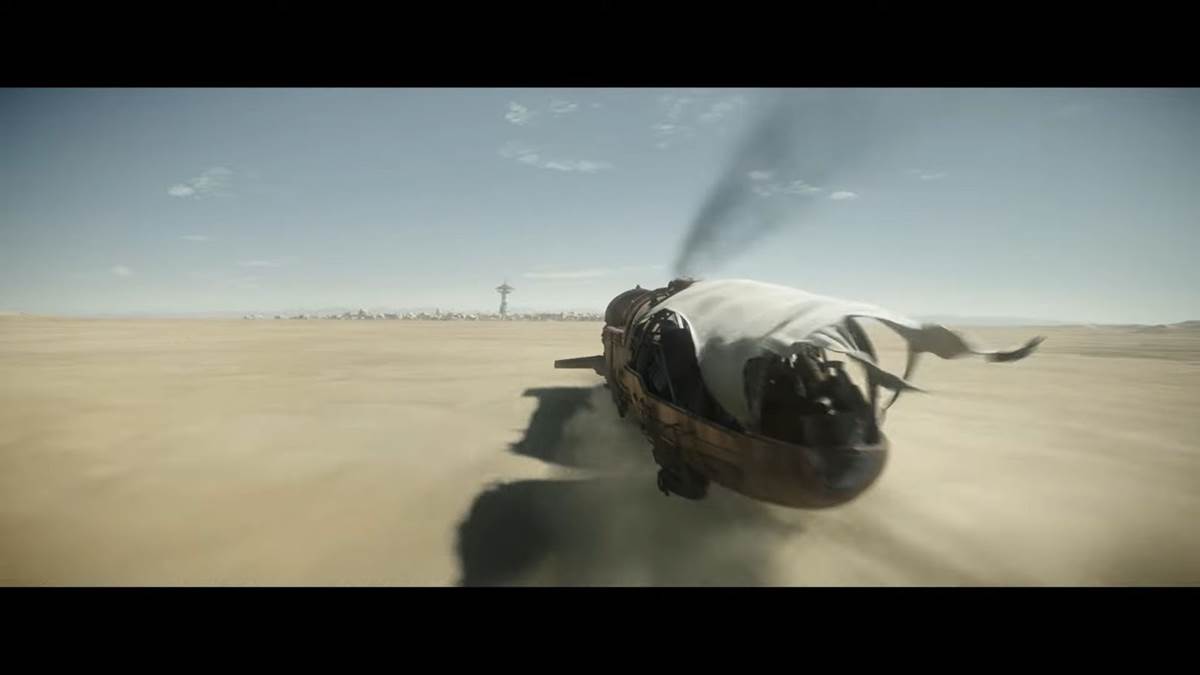 Shot 12: A land vehicle towing a trailer full of passengers speeds toward a settlement in the distance. Again, this could be either Mos Eisley or Mos Espa, though that tower in the center doesn’t look familiar.