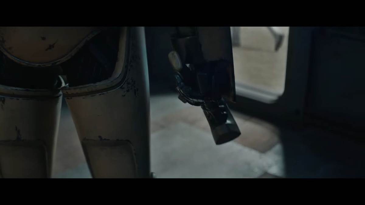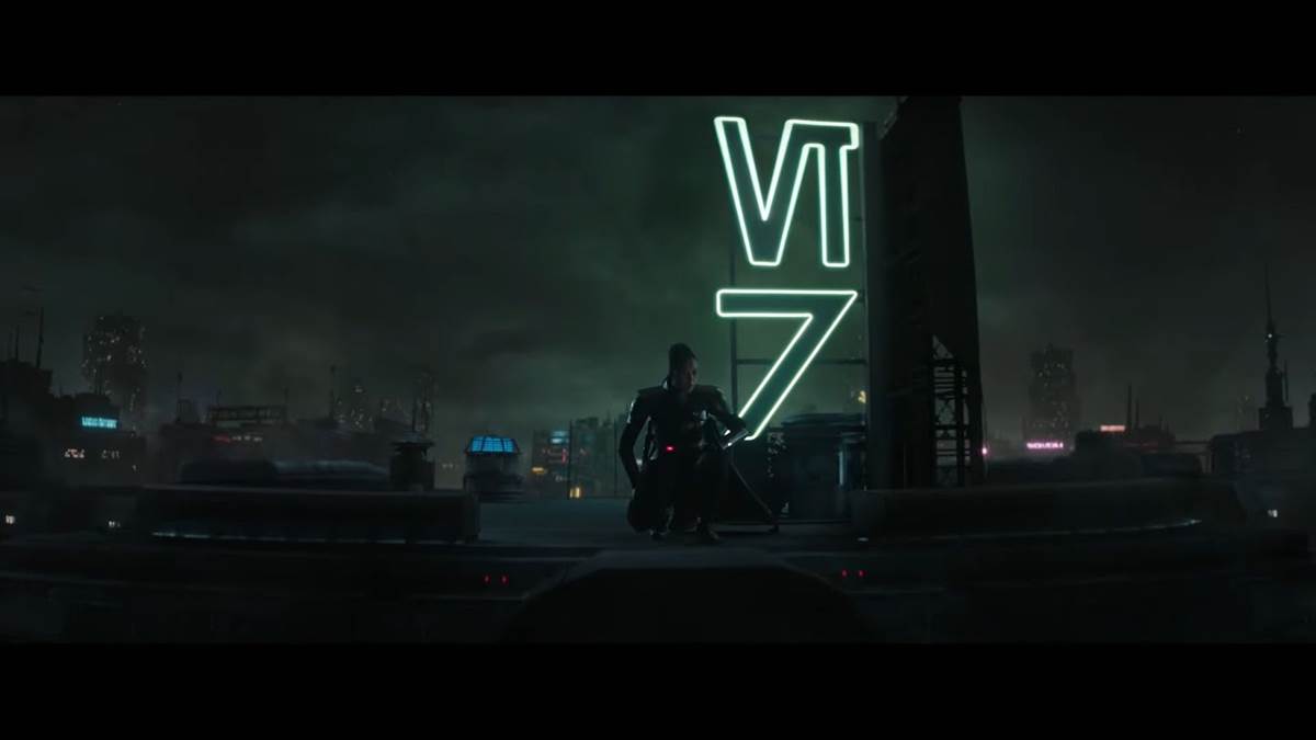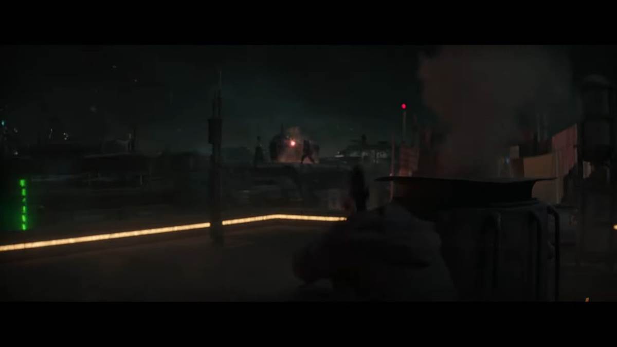 Shot 18: Reva crouches on a rooftop on the bustling planet of Daiyu (as revealed in today’s Entertainment Weekly article about Star Wars: Obi-Wan Kenobi). The Aurebesh in the neon lights here reads “ER.”