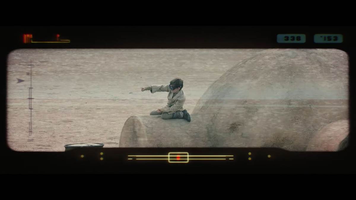 Shot 6A: Obi-Wan’s point-of-view looking through macrobinoculars at the Lars homestead, surrounded by moisture vaporators. Beru Lars (Bonnie Piesse) stands in the entrance, while Owen Lars (Joel Edgerton) walks to the right. A roughly ten-year-old child sits on the homestead’s main structure.