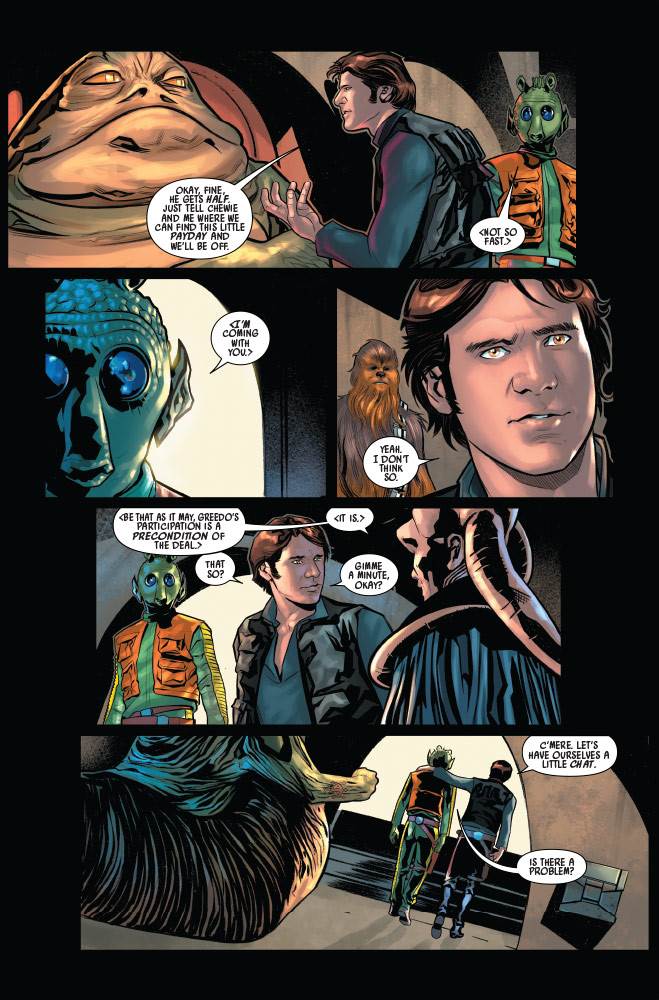 The first issue of Marvel’s new comic-book series Star Wars: Han Solo & Chewbacca opens with a one-panel flash-forward to Han frozen in carbonite– a quick reminder that while the bulk of the current ongoing Star Wars comic titles are set between the events of The Empire Strikes Back and Return of the Jedi, this series is rewinding time a bit to the period before Episode IV - A New Hope, when the title characters were smugglers and thieves working for crimelord Jabba the Hutt.