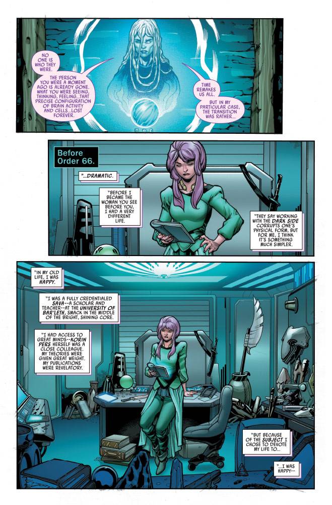 Well, she was known only as the Archivist until this issue, which gives her previous name as Madelin Sun (almost certainly a nod to real-world Lucasfilm archivist Madlyn Moskowitz)-- a scholar who studied the dark side of the Force prior to Order 66. Once the Jedi Order was eliminated and their beliefs outlawed by Emperor Palpatine, Sun gave up her academic pursuits and worked as a junk dealer until one day when the Empire came calling. Rescued by Qi’ra, Sun was then enlisted to track down Jedi Master Yoda in his exile– a task she performs successfully, though the question remains whether she wishes to divulge her findings to Crimson Dawn. Along the way she interrogates Jeremoch Colton (the character played by original Boba Fett actor Jeremy Bulloch in Star Wars: Episode III - Revenge of the Sith) and finds that she has a distaste for using the Ascendant’s dark-side artifacts Qi’ra has in her collection.