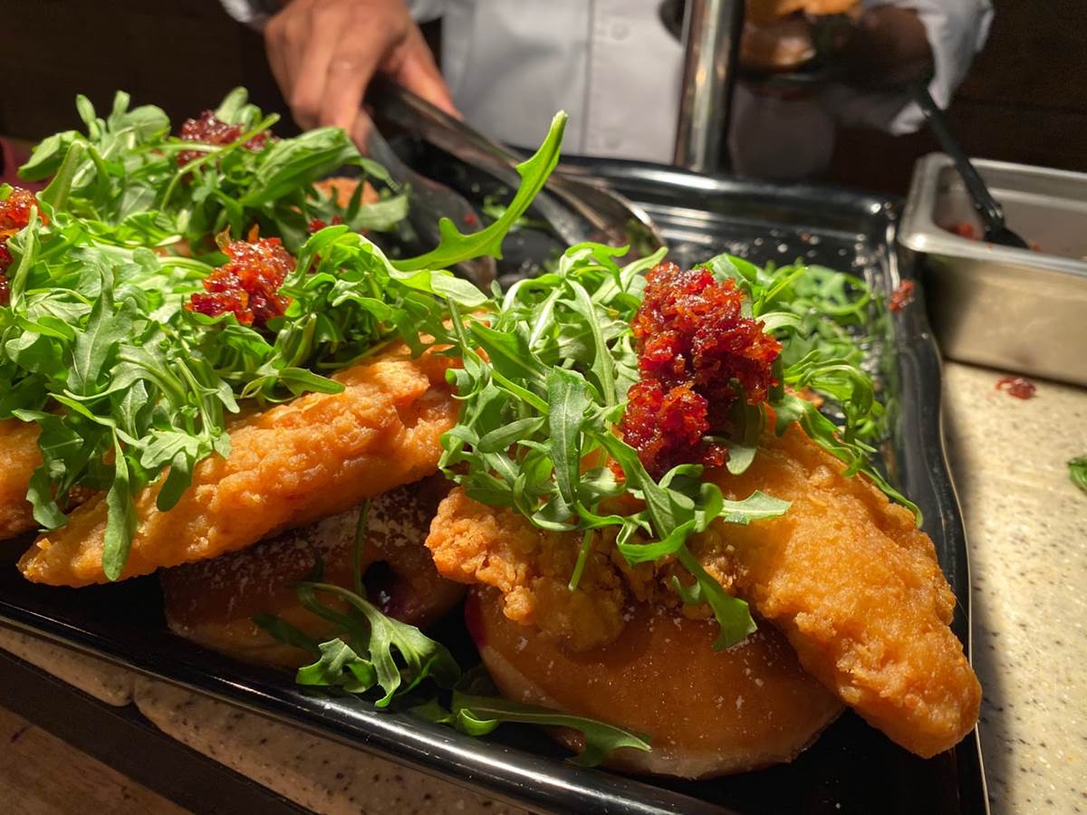 Perhaps the most creative item was this Boysenberry Filled Donut Open Faced Chicken Sandwich topped with Arugula and Bacon Jam.