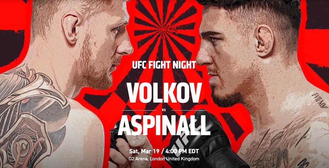 UFC Fight Night: Volkov vs. Aspinall will be held Saturday, March 18 at 7 PM ET. Fight fans can watch live on ESPN+.