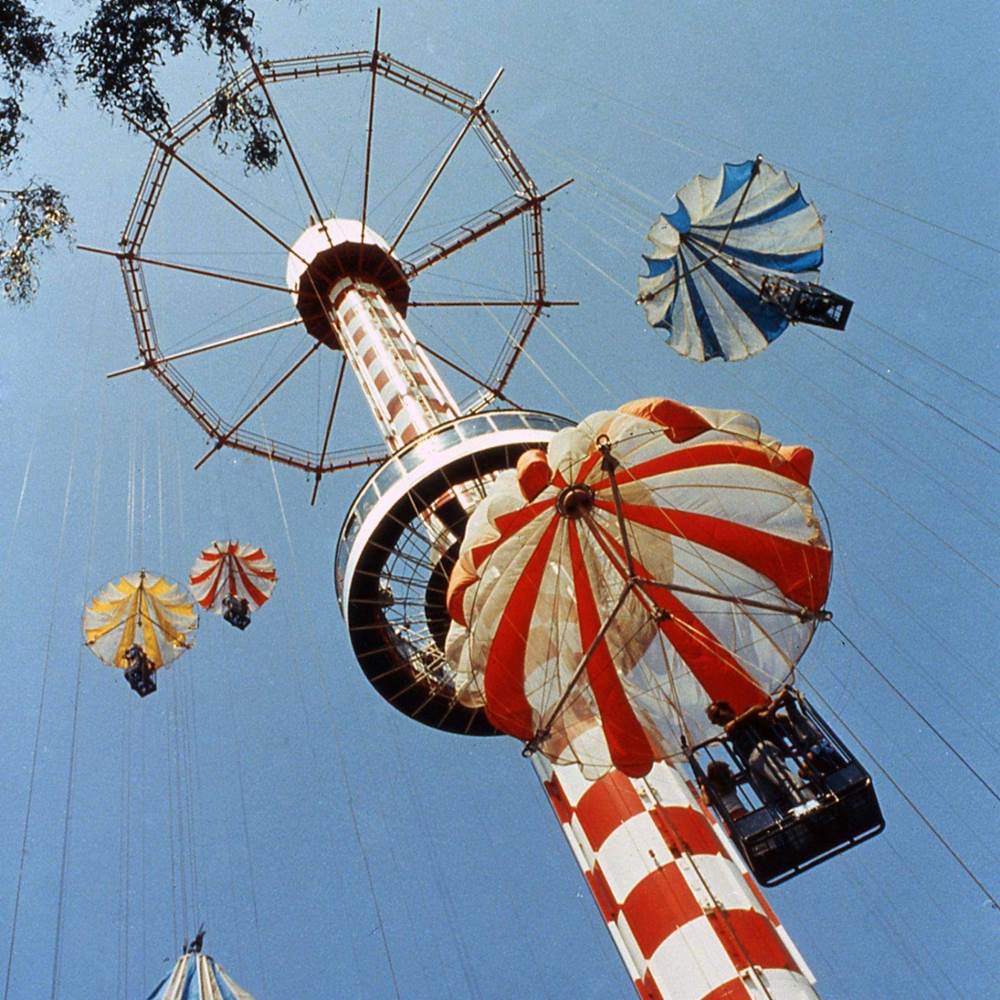 Now this was a unique looking attraction! Built around the edge of the still-standing Sky Cabin tower, the Sky Jump took passengers in boxed cages and gently dropped them 200ft back down to the ground. I’m sure this was a psychologically thrilling ride, with just how open the experience was. Knott’s removed the Sky Jump from the tower in 1999, however the Sky Cabin still operates to this day. If you want to know what this experience feels like, the last remaining installation is still in operation at Six Flags Great Adventure in New Jersey.