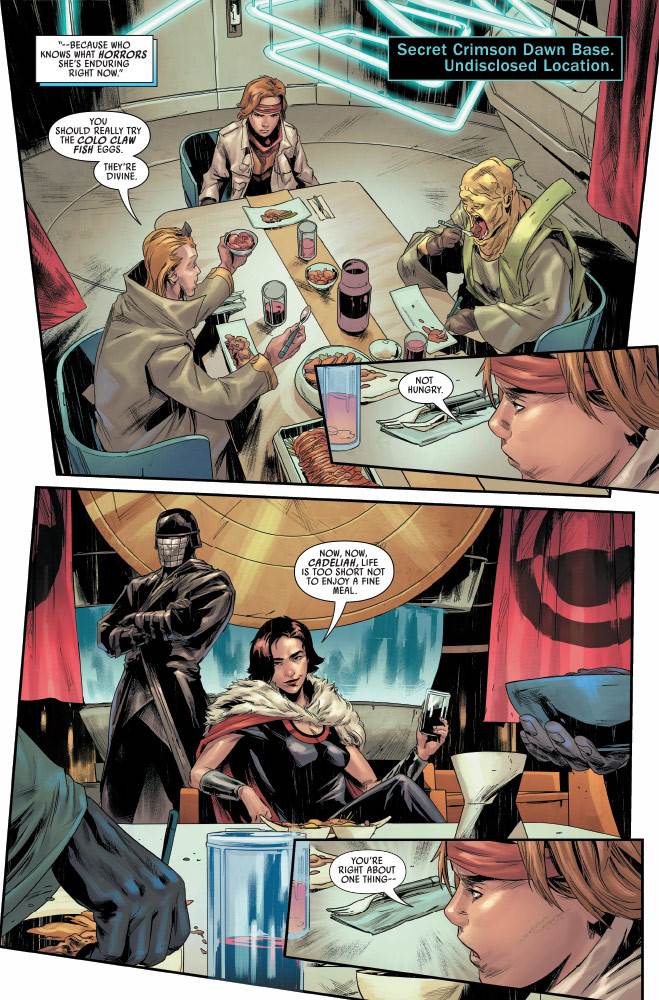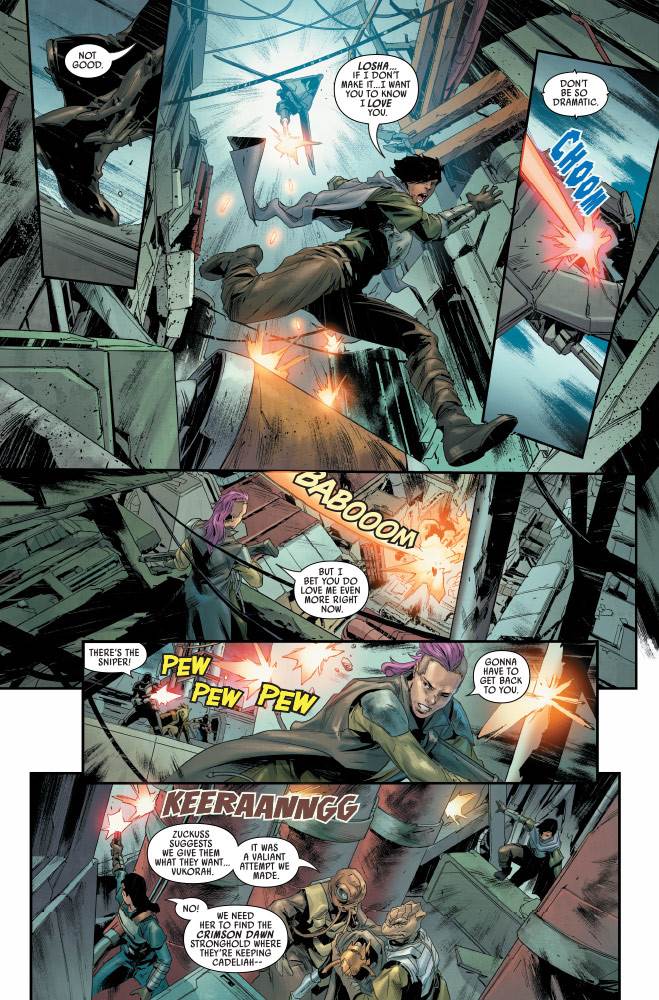 This is another action-heavy issue, but I enjoyed it quite a bit more than last week’s– first because the artwork by Paolo Villanelli worked a lot better for me in this context, and secondly because Ethan Sacks’s scripting and dialogue feels crisper and tighter now that the overarching plot of Bounty Hunters has found some forward momentum. There’s a big chase scene through Coronet City with more than a couple explosions, but it’s all exciting enough with the sniper Losha running along the rooftops to catch up with the others before they reach their rendezvous point. We also get a very welcome interlude-style cutaway to an undisclosed location, where Crimson Dawn (hence the “Crimson Reign” crossover tie-in advertised on this issue’s cover) is holding star-crossed crime syndicate heiress Cadeliah in captivity. Lady Q’ira has an extended cameo– for the first time in this title outside of War of the Bounty Hunters– and we get a little taste of what her plans for Cadeliah might eventually be.