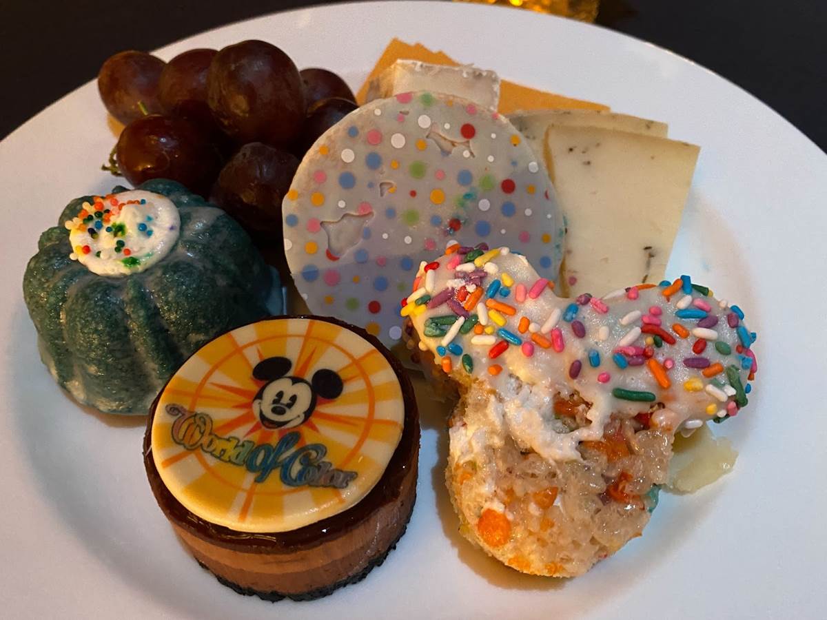 Also returning on April 22nd is World of Color at Disney California Adventure park. Reserved seating comes with a dessert party, which includes a plate of treats including a blueberry bundt cake, a rainbow cake crispy treat, triple chocolate cheesecake, raspberry-filled sugar cookie, grapes, assorted cheeses, and crackers.