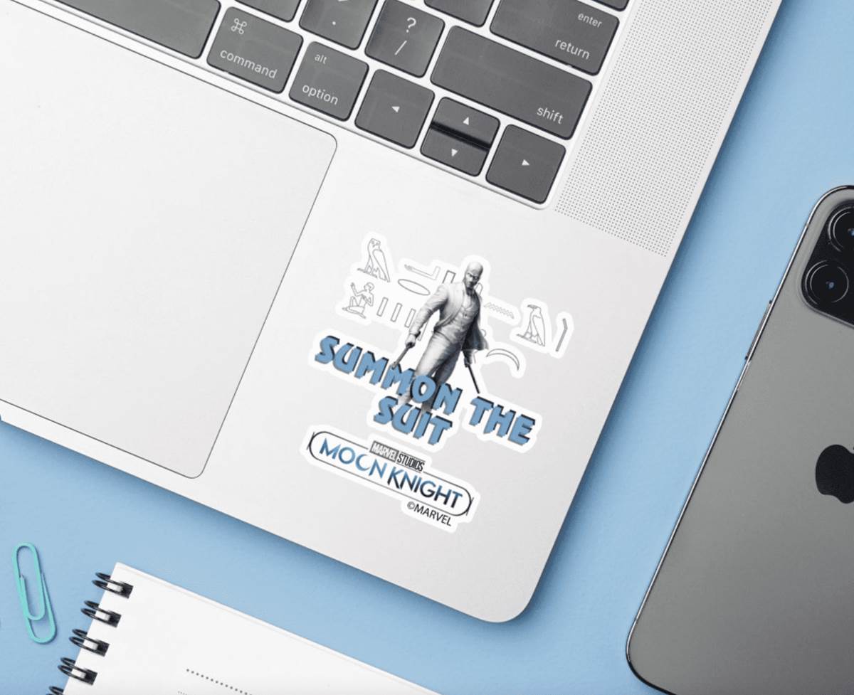 Decorate your home with Moon Knight themed merchandise, from Displate, Fathead, and Zazzle. These customizable items will help you to style your space the Marvel way as you bring the mysterious hero home. This assortment featured both Marc (Moon Knight) and Steven (Mr. Knight) on decals, stickers, a journal and even a phone case.